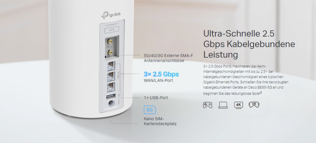 Wie der Deco BE65 (4x) verfügt auch der Deco BE65-5G über mehrere 2.5 Gbps-Ports (3x)