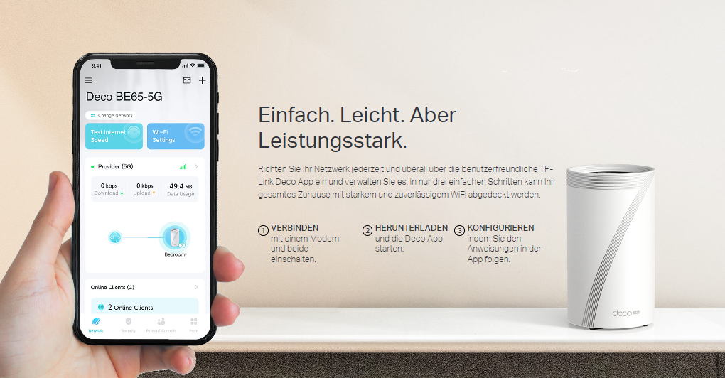 Trotz dieser Fülle an Funktionen und Möglichkeiten bleiben Einrichtung und Einstellung des Mesh-Netzwerkes dank der TP-Link-Deco-App ganz einfach: Einfach für iOS oder Android aus dem jeweiligen App-Store auf Smartphone oder Tablet herunterladen, mit dem Deco BE65-Router verbinden und den klar verständlichen Anweisungen in der jederzeit intuitiv zu bedienenden Anwendung folgen.