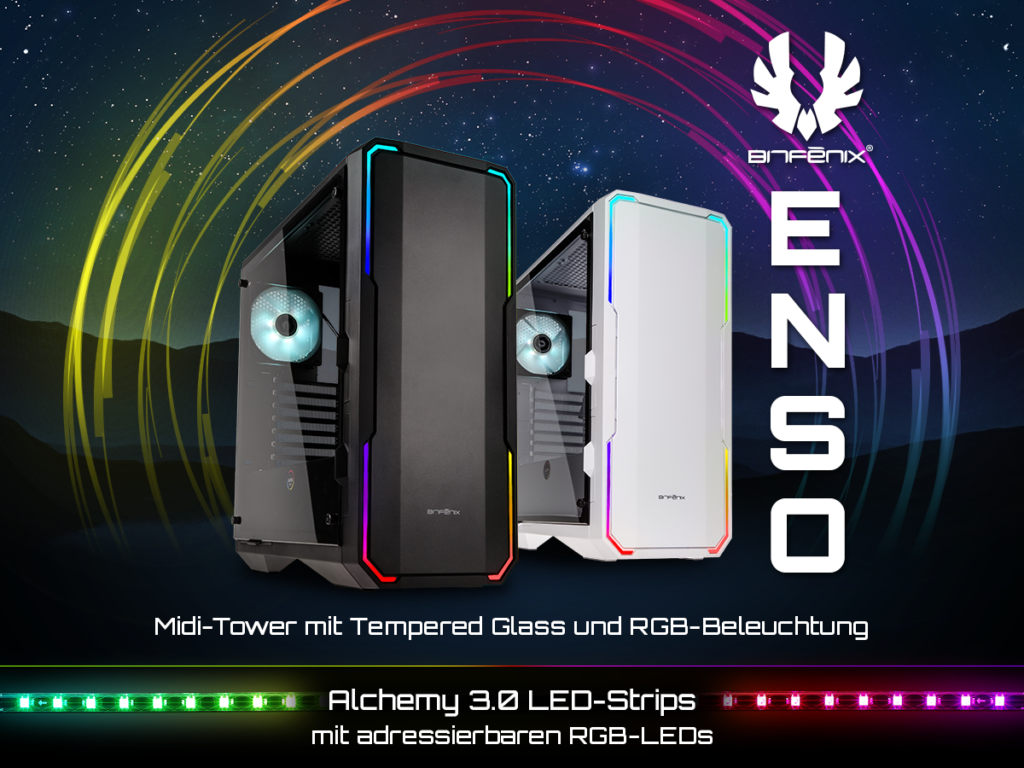 Berlin, 15.11.2017 – BitFenix stellt gleich zwei perfekt harmonierende Produkte mit individualisierbarer RGB-Beleuchtung sowie ASUS Aura Sync Kompatibilität für Enthusiasten vor. Der Enso Midi-Tower kann mit kompakten Abmessungen trotz ausgiebigem Hardware-Support, modernen Features und durchdachten Detaillösungen sowie einem Tempered-Glass-Seitenfenster punkten. Die RGB-LED-Beleuchtung in der Front kann durch den integrierten Controller oder ein passendes Mainboard geregelt werden. Die 30 bis 60 cm langen RGB-Strips aus der Alchemy 3.0 Serie sind flexibel per mitgeliefertem Klebeband oder Neodym-Magneten fixierbar. Jetzt bei Caseking.