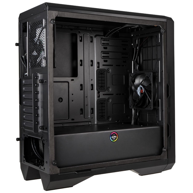 Durch einzeln adressierbare LEDs werden komplexe dynamische Beleuchtungseffekte in 16,8 Millionen Farben möglich, die sich in jedes bestehende Farbschema integrieren lassen. Über die ASUS Aura Sync Software können sie konfiguriert und mit anderen kompatiblen RGB-Komponenten synchronisiert werden. Über einen Button am I/O-Panel lassen sich aber auch ohne kompatibles Mainboard vorprogrammierte Effekte über den integrierten Controller durchschalten. Darüber hinaus bietet das Enso ein großes Tempered-Glass-Seitenfenster mit Schaumgummi-Schalldämmung, Wasserkühlungs-Support und eine aufgeräumte Hauptkammer, da Datenträger und Kabel beinahe komplett hinter dem Mainboard Tray und in der PSU-Shroud verschwinden.
