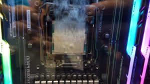 Der Intel Core i7-7800X der hier zum Einsatz kommt, wird unter Vollauslastung mit Prime95 79°Celsius warm. Durch die Abwärme des Prozessors und der Grafikkarte erreicht die Kühlflüssigkeit ihren Siedepunkt und steigt gasförmig in der Kühlkammer nach oben. Im oberen Teil der Kammer befindet sich ein 240 mm Radiator der die Flüssigkeit kühlt, diese erreicht dadurch wieder ihren flüssigen Zustand und tropft wieder herunter.