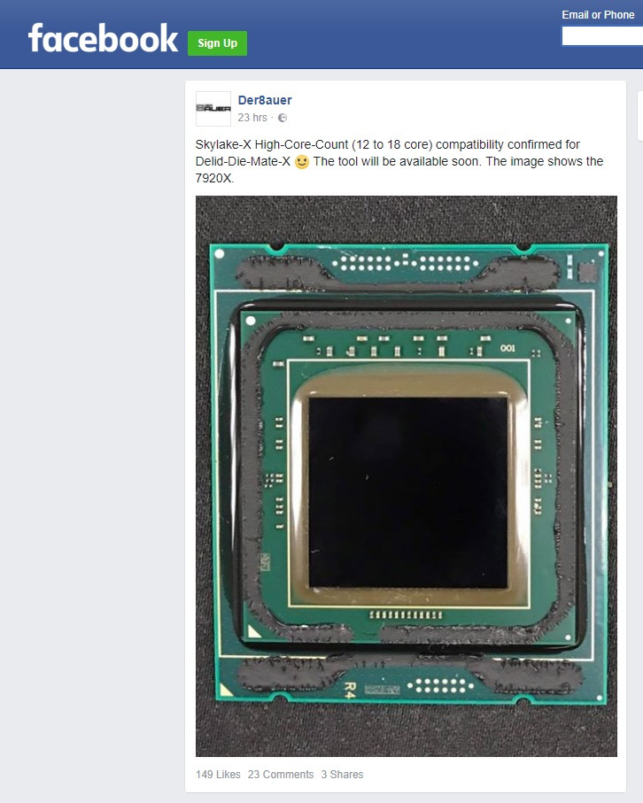 Der8auer köpfte den Intel Core i9-7920X mit seinem Tool „Delid-Die-Mate-X“. Er stellte fest, dass der DIE wesentlich größer ist, als der des Intel Core i9-7900X mit 10 Kernen. Intel hat sich auch hier gegen das Verlöten des Heatspreaders bei HCC CPUs entschieden. Ein Verlöten würde für bessere Kerntemperaturen und somit größere Übertaktungsmöglichkeiten sorgen. Der8auer gelang es den 12 Kern Intel Core i9-7920X zu köpfen und er rät nicht davon ab. Das kann für uns bedeuten, dass es nur ein kleines Risiko gibt die CPU zu beschädigen. Der8auers Facebook-Post vom geköpften Intel Core i9-7920X dient als Vorschau auf eines seiner üblichen YouTube-Videos.