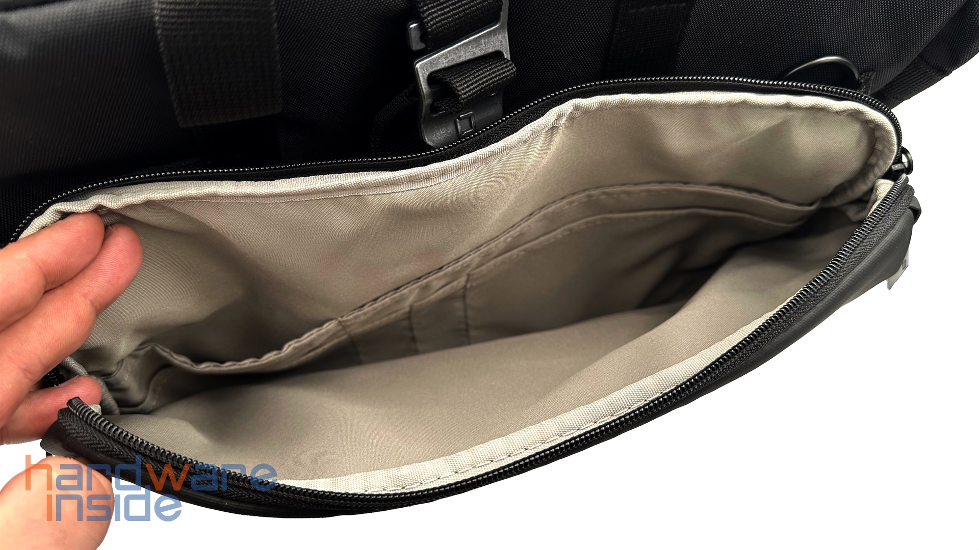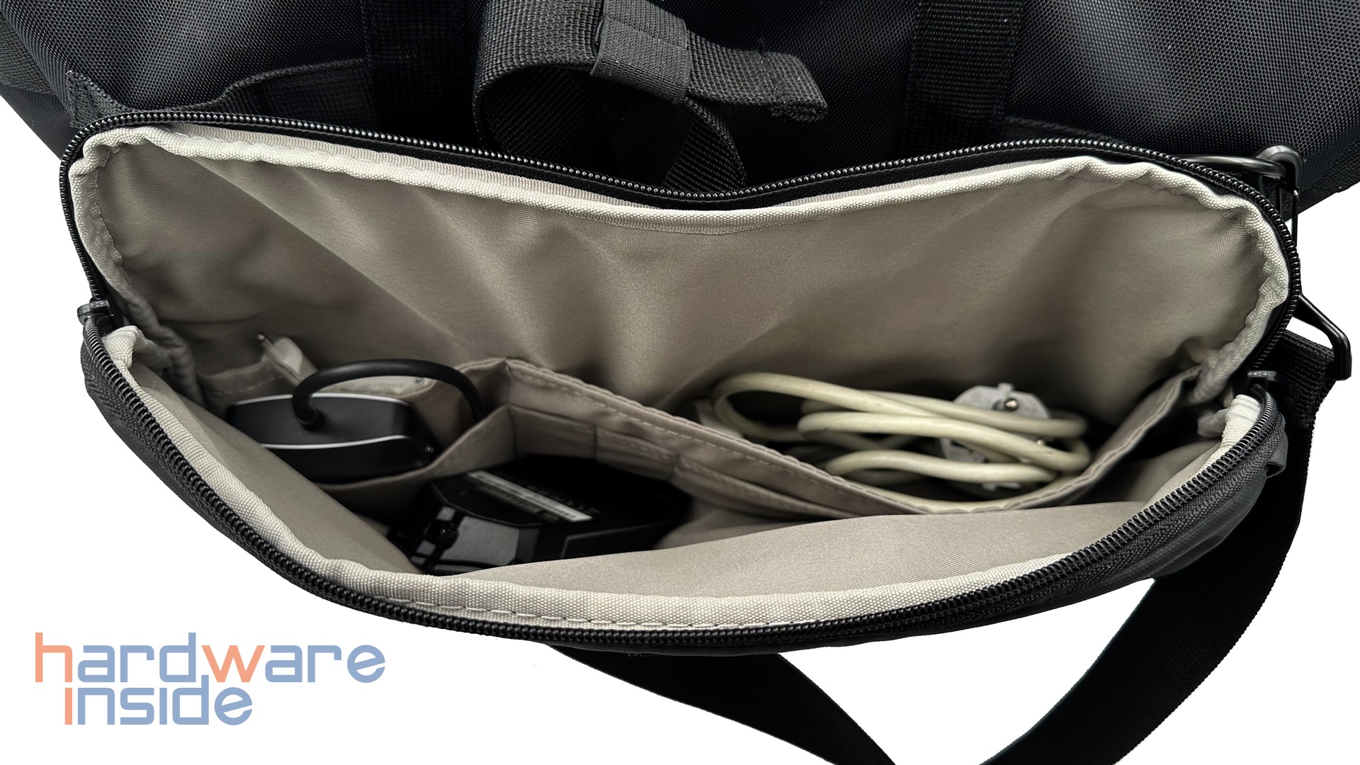 Wir sehen uns zunächst das zweite Fach an. Dieses ist durch zwei Reißverschlüsse gesichert. Das Fach ist leicht gefüttert und verfügt im inneren über ein helles Innenleben. Hier sind mehrere Fächer für Zubehör wie Kugelschreiber, Netzteil, Kabel, externe Festplatten oder Handy zu finden. Das Fach eignet sich besonders für Gegenstände, auf die man schnell zugreifen möchte.
