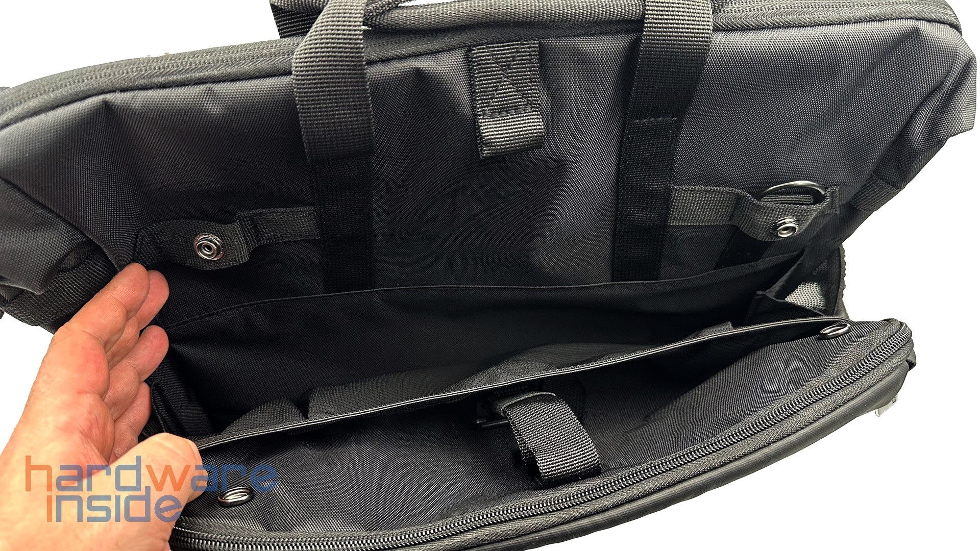 Das nächste Fach stellt eine Besonderheit dieser Laptoptasche dar. Es wird mittels zweier Druckknöpfe teilweise verschlossen, so kann man jederzeit auf den Inhalt zugreifen. Wird aber mehr Platz benötigt, so kann durch das Öffnen der Druckknöpfe das Fach erheblich vergrößert werden. Das ist in etwa praktisch zum Mitführen einer großen Flasche, Sportzeug oder ein Handtuch. Hier ist auch noch ein weiteres Fach für Kleinigkeiten vorhanden. Hier sehen wir auch eine der Ösen für den Schultergurt, die andere Öse befindet sich auf der Rückseite, so wir der Gurt diagonal über die Tasche gefüht.