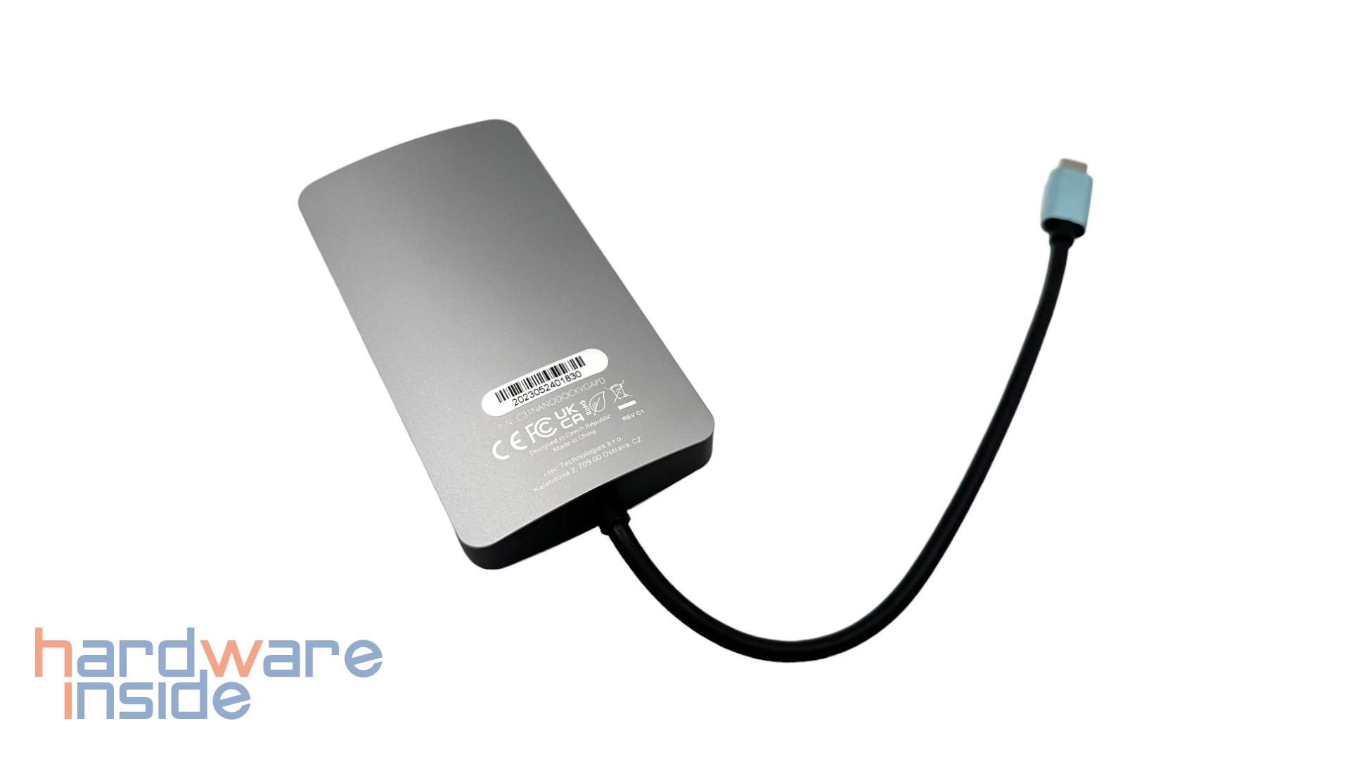 Auf der Rückseite findet sich der Barcode des Produktes sowie einige Logos von Zertifikaten. Abschließend macht diese Docking Station auf uns optisch einen wertigen Eindruck. Das Gehäuse besteht überwiegend aus Metall, wobei der Hersteller keine Angaben macht, um welches Material es sich handelt. Da es aber nicht magnetisch ist, gehen wir von Aluminium aus, welches mit einer silbernen Beschichtung versehen wurde.