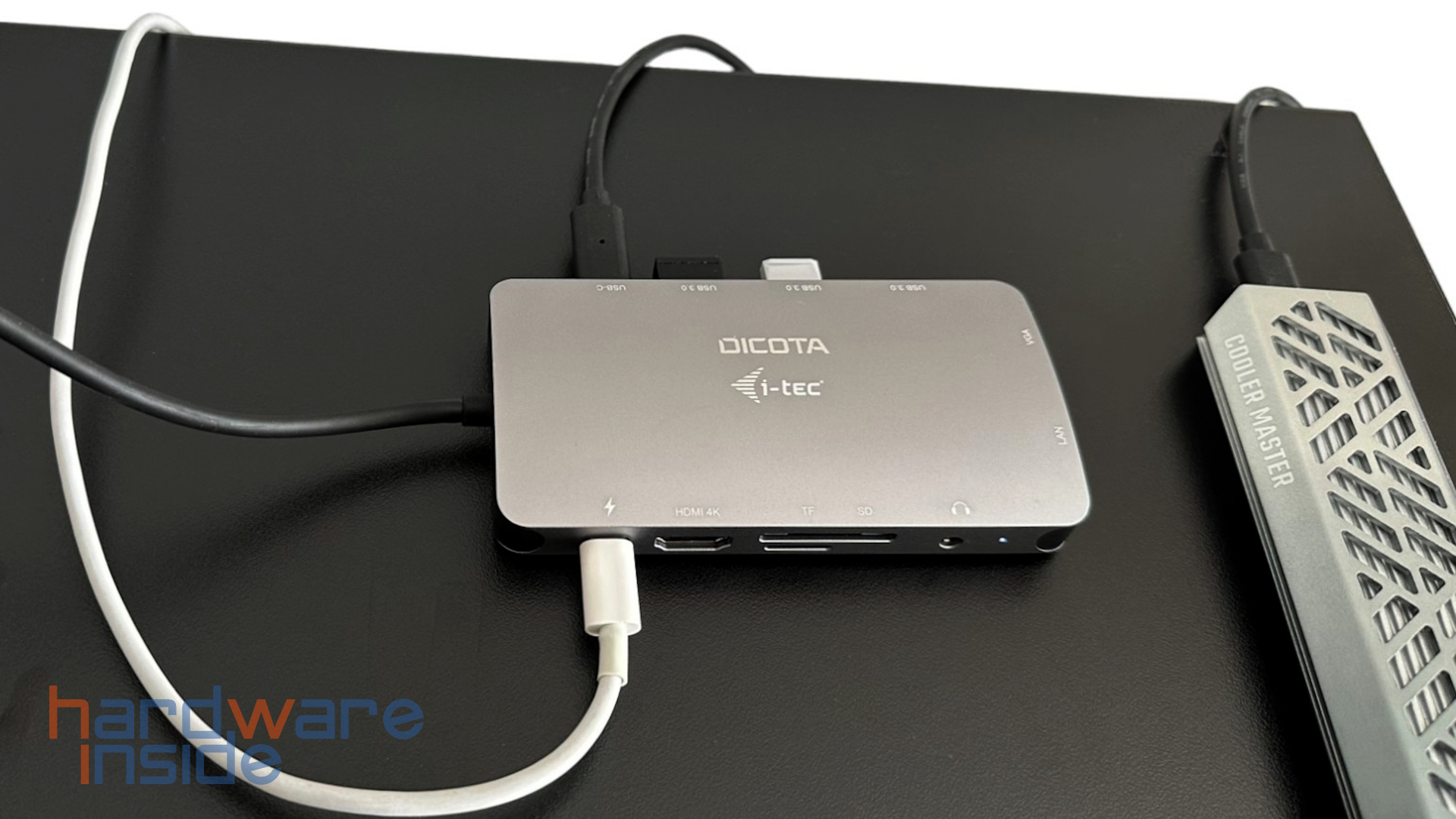 Die Rückseite bietet drei vollwertige USB-Typ-A Anschlüsse, welche dem USB 3.1 Standard der ersten Generation angehören. Daneben befindet sich ein weiterer USB-Typ-C Anschluss. Bei den USB-Typ-C Anschlüssen gibt es vom Hersteller keine Angaben dazu, welcher Standard dort zum Tragen kommt. Es ist aber davon auszugehen, dass es sich hier um denselben Standard handelt, der auch bei den USB-Typ-A Anschlüssen zum Einsatz kommt. Von der linken Seite geht das 20 cm lange Anschlusskabel mit USB-Typ-C Stecker ab. Auf der Oberseite ist jeder Anschluss beschriftet, sodass hier keine Zweifel aufkommen. Mittig ist das Logo des Herstellers aufgedruckt.