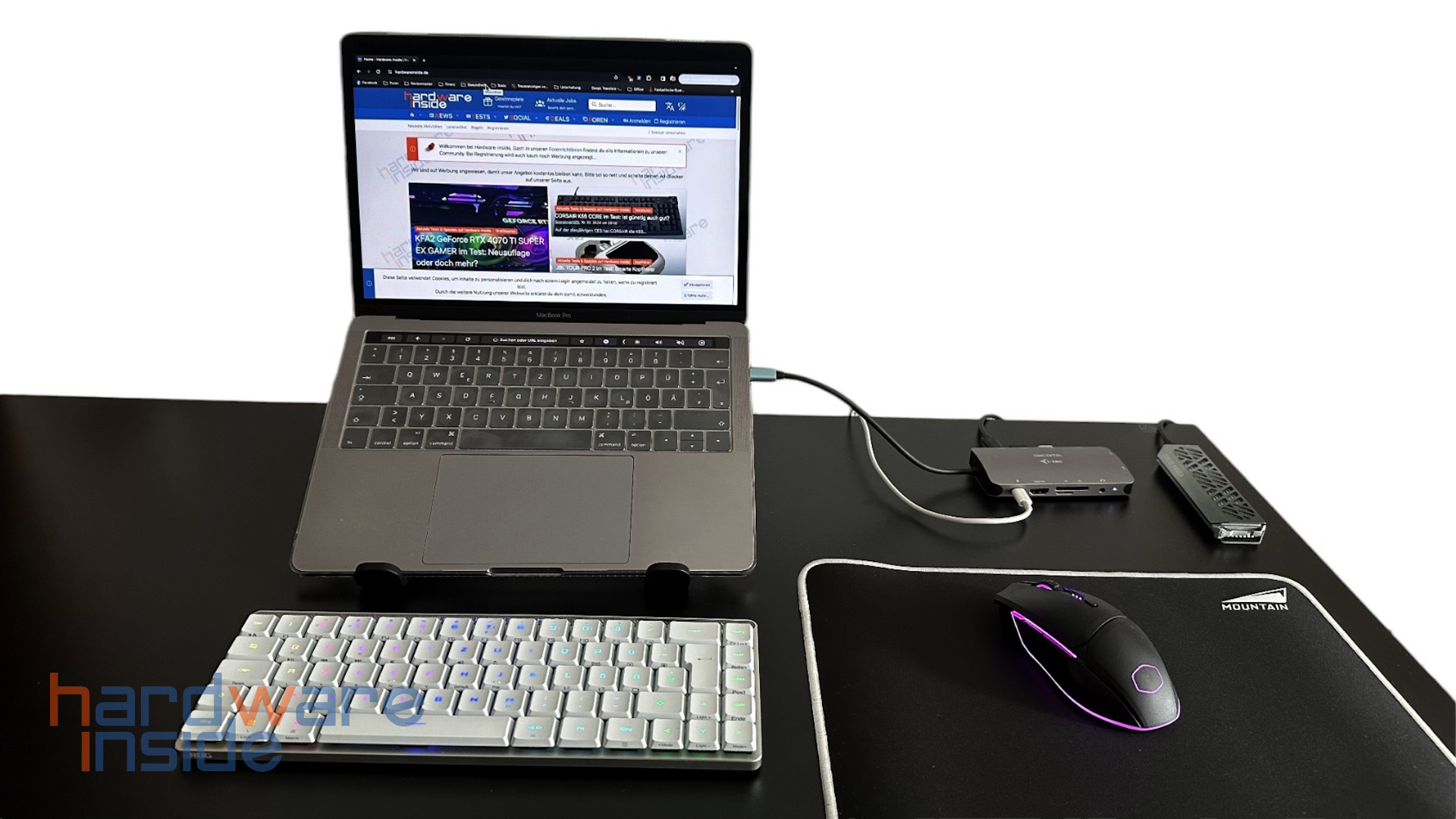 Die Dicota USB-C Portable 10-in-1 Docking Station testen wir an einem der letzten MacBook Pro mit Intel Prozessor und Touch-Bar. Es verfügt über vier Thunderbolt 3 Anschlüsse. An die Docking Station schließen wir in diesem Fall die Funkempfänger von Tastatur und Maus, sowie eine externe SSD an. Außerdem verbinden wir das Netzteil über die Docking Station mit dem MacBook Pro.