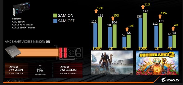 Durch die AMD Smart Access Memory und Rage Mode Funktionen, erhält die CPU Zugriff auf den Speicher der GPU. Dies ermöglicht es, Limitierungen der Bandbreite beim Spielen mit 4K Auflösung zu vermeiden. Durch den schnelleren Zugang zum GDDR6 GPU Speicher bei Motherboards der AMD 500 Serie in Verbindung mit Ryzen™ 5000 Prozessoren und Radeon™ RX 6000 VGA Karten wird die Rechen- und Gaming-Leistung der CPU verbessert. In Tests mit aktivierten Smart Access Memory und Rage Mode Funktionen konnte sich eine Leistungssteigerung beim Spielen in 1080p um 17% feststellen lassen, während die Steigerung bei 2K oder 4K Auflösung noch 10% beträgt.