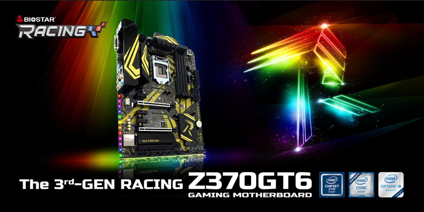 Taipeh, Taiwan, 10. Oktober 2017 – BIOSTAR stellt das RACING Z370GT6 Gaming Motherboard vor, die dritte Generation der beliebten BIOSTAR RACING Serie, die das Potenzial von Intels achter Generation der Core Desktop-Prozessoren für Gamer, Redakteure und Modder maximiert. Das RACING Design hat sich weiterentwickelt zu einer brandneuen Aufmachung. Es besteht jetzt aus einem modischen Gold und einem schwarzes Luxusmotiv, das in die Platine des Motherboards und die Kühlkörper “ hinein tätowiert“ ist. Darüber hinaus ist die RGB-Beleuchtung viel dynamischer und der weiterentwickelte “VIVID LED DJ” gibt den Nutzern mehr Kontrolle über die Beleuchtung als je zuvor. Die Hardware wurde stärker und leistungsfähiger mit hochwertigen Feststoffkondensatoren, Dual-BIOS, solidem PCI-E Schutz und mehr, um Spiele und Multimedia-Anwendungen flüssiger und ohne Aussetzer betreiben zu können.