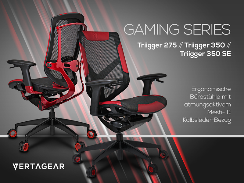 Berlin, 22.11.2016 – Vertagear erweitert das eigene Chair-Portfolio nach den erfolgreichen Gaming-Ablegern der SL-Serie und präsentiert mit dem Triigger 275, dem Triigger 350 und dem Triigger 350 SE drei neue Bürostühle in toller Optik, die aus einem stabilen und massiv konstruierten Aluminium-Rahmen bestehen und über einen atmungsaktiven Mesh-Bezug mit Kalbsleder-Applikationen verfügen. Darüber hinaus bieten die Stühle enorm umfangreiche Verstellmöglichkeiten und verfügen über ein hohes Maß an ergonomischer Flexibilität. Jetzt bei Caseking vorbestellen.