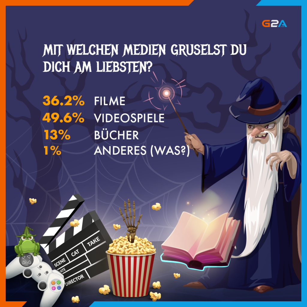 Das zweitbeliebteste Horrormedium waren Filme mit 36,2 % der Antworten, während Bücher und „Sonstiges“ mit 13 % bzw. 1 % weit abgeschlagen waren. Auf die Frage nach einem klassischen Horror-Franchise, das sie gerne in einem Videospiel sehen würden, waren die Ergebnisse sehr gleichmäßig verteilt, wobei Saw mit 16,7 % knapp vor Dracula mit 15,8 % gewann. Den dritten Platz belegte Freitag der 13. mit 15,2 %. Der erste und der dritte Platz sind auch deshalb interessant, weil beide Franchises bereits Spieleumsetzungen erhalten haben: Saw im Jahr 2009 und Freitag der 13. im Jahr 2017. Offenbar sind jedoch beide Spiele nicht mehr im Bewusstsein der Spieler – oder diese wünschen sich einfach zeitgemäße Neuumsetzungen.