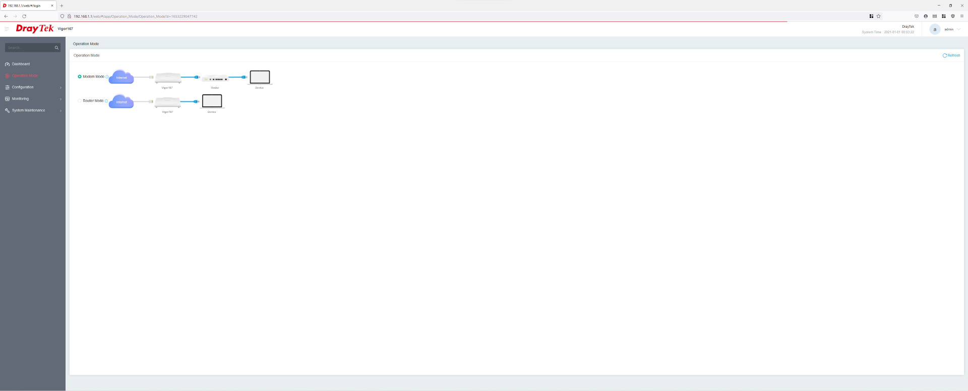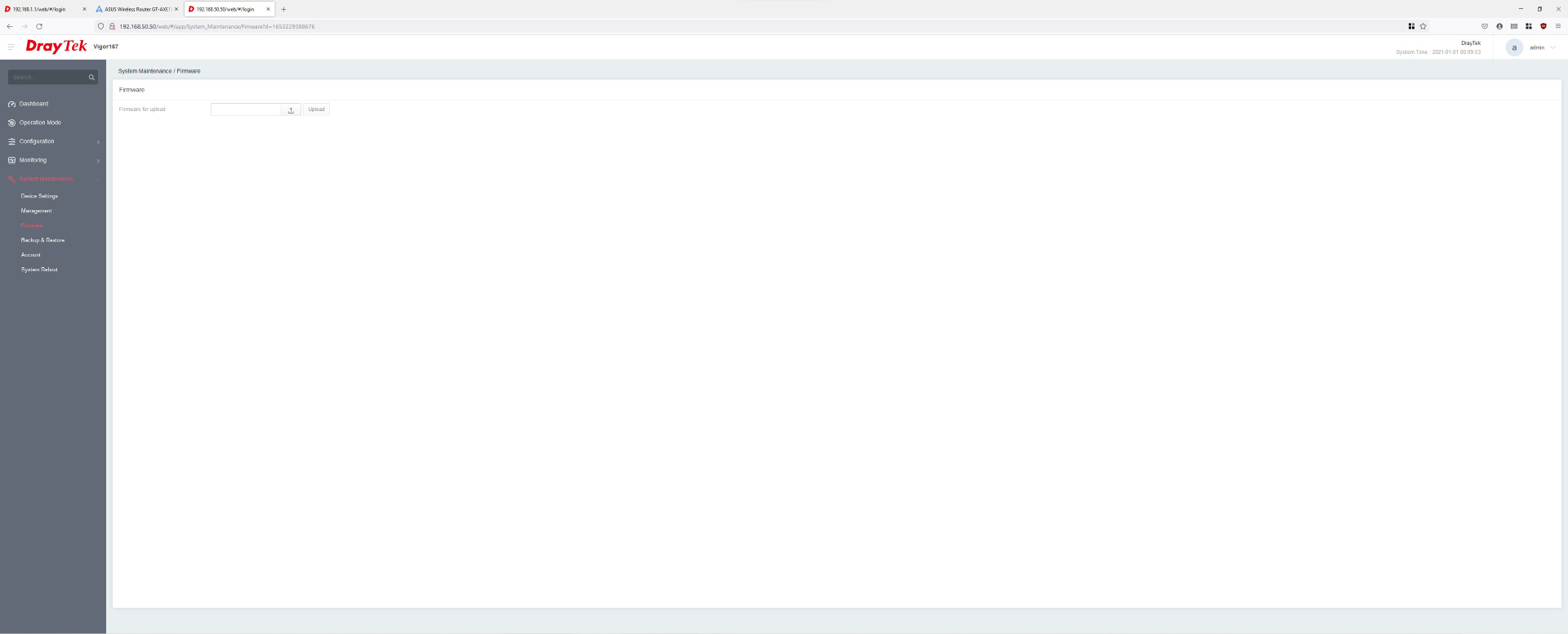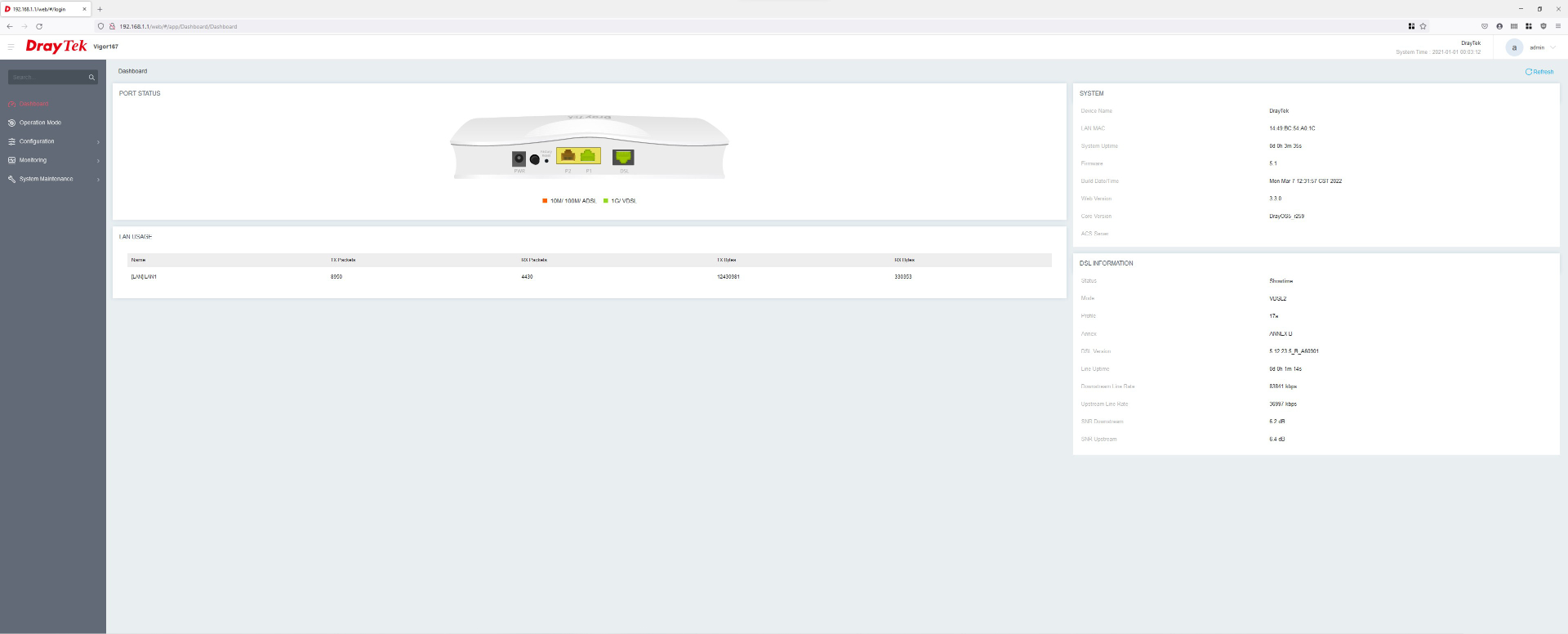 Über LAN 2 gelangt das Internet über das Modem zum Router, per LAN 1 wird der spätere Zugriff (nach Konfiguration der IP) ermöglicht. Standardmäßig ist bereits der Modem-Modus aktiv, es kann aber auch auf „Router“ umgeschaltet werden. Wichtig sind die Angaben unter „Dashboard“, allen voran das SNR (Signal-Rausch-Verhältnis). Bei Werten unter 6 dB arbeitet der DrayTek Vigor167 nicht anständig, aber auch eine Fritz!Box kapituliert im Normalfall bei diesen Werten. In unserem Fall liegen etwa 6,6 – 7,2 dB im Downstream an, was gerade noch in Ordnung geht. Neben diversen Einstellungen, die nach Belieben angepasst werden können, wird in dieser Übersicht auch ein Firmware-Update ermöglicht. Dazu muss erst die passende Datei bei DrayTek heruntergeladen und dann in der Benutzeroberfläche hochgeladen werden.
