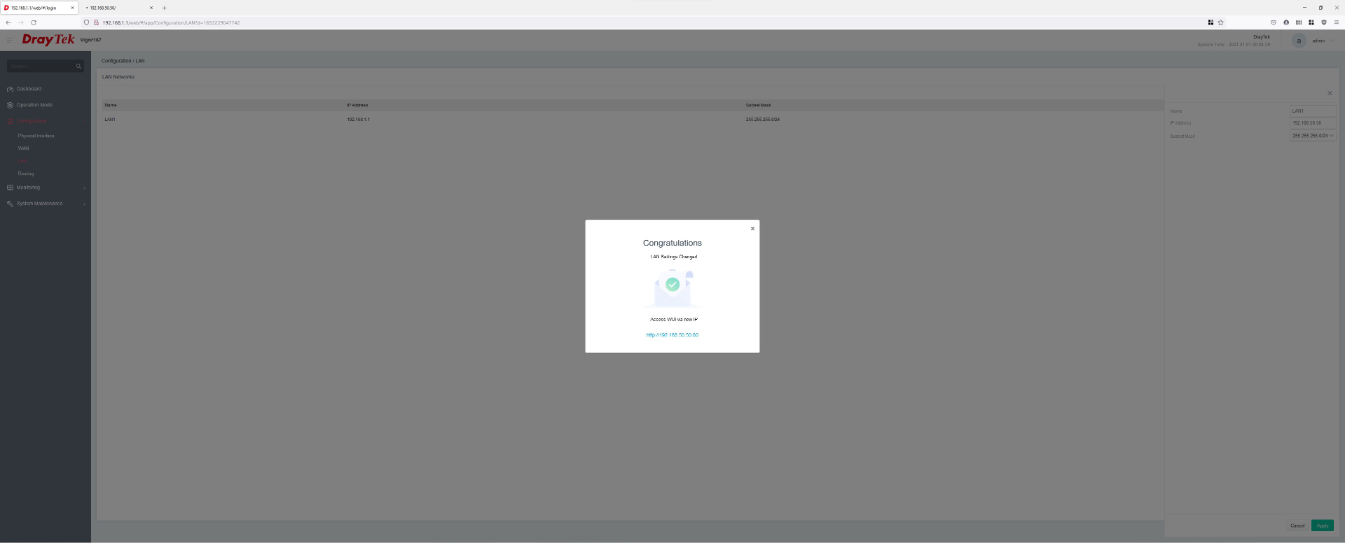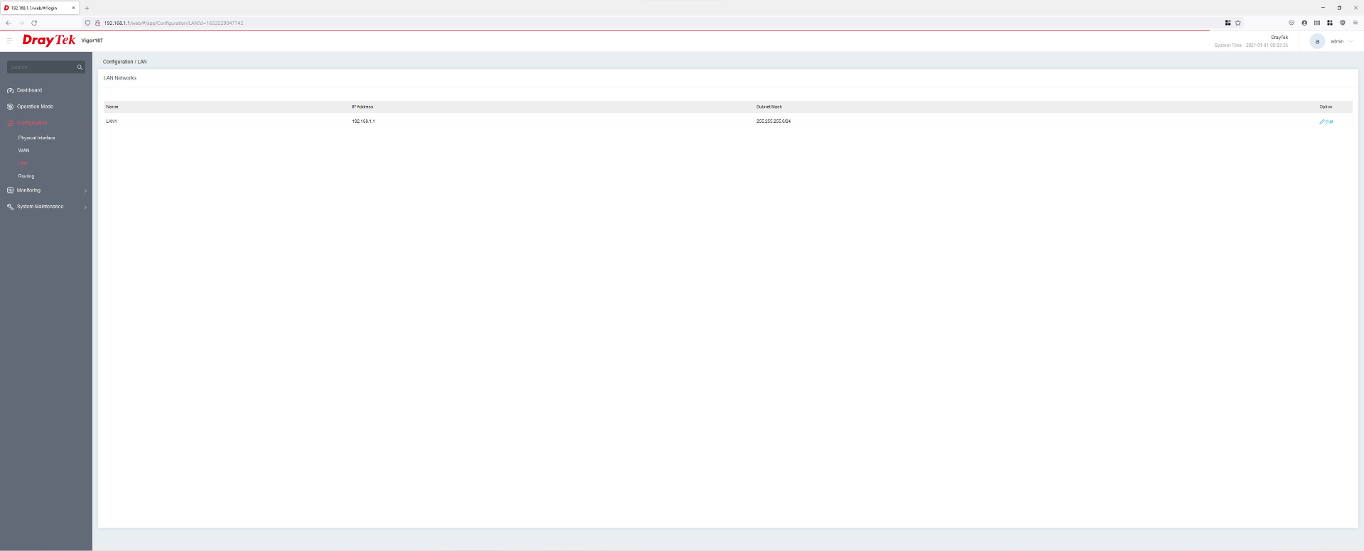 Die Benutzeroberfläche wird über die vorgegebene IP 192.168.1.1 mit einem beliebigen Webbrowser aufgerufen. Welcher der zwei LAN-Ports dabei verwendet wird, spielt keine Rolle. Wichtig ist nur, dass eine direkte Verbindung zum Computer besteht. Allerdings kann nur einer der zwei LAN-Ports konfiguriert werden, bei diesem Modell handelt es sich um den LAN 1-Port. Vorher sollte man die IP des eingesetzten Routers in Erfahrung bringen (oder später anpassen), damit sich die IPs bis auf den letzten Zahlenblock gleichen. Wurde die IP entsprechend abgeändert, kann später per Webinterface und Verbindung zum Router die Benutzeroberfläche aufgerufen werden.