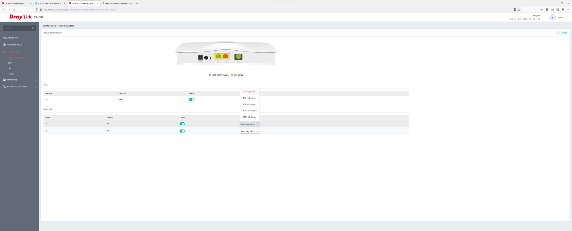 Der Vigor167 ersetzt unsere Fritz!Box 7590. Als Router kommt in unserem Testlabor der ASUS ROG Rapture GT-AXE11000 zum Einsatz, den wir hier getestet haben. Da der Router von AVM keinen dedizierten Modem-Modus hat, kann es im schlimmsten Fall zu einem Doppel-NAT führen. Das bedeutet, dass zwei „Gateways“ versuchen einen Rechner (bspw. PC oder Konsole) mit dem Internet zu verbinden, aber keine Verbindung mehr zu eben diesem möglich ist. Auch können Leistungsprobleme auftreten, die Bandbreite wird verringert oder Latenz erhöht. Daher sollte man auf den Einsatz von zwei Routern verzichten und stattdessen ein reines Modem einsetzen, in Verbindung mit einem zusätzlichen Router. Der DrayTek Vigor167 kann mit der neusten Firmware auch als Router eingesetzt werden, der Computer kann also direkt über den Vigor167 mit dem Internet verbunden werden. WLAN steht nicht zur Verfügung, da die dafür notwendige Technik nicht verbaut wurde.