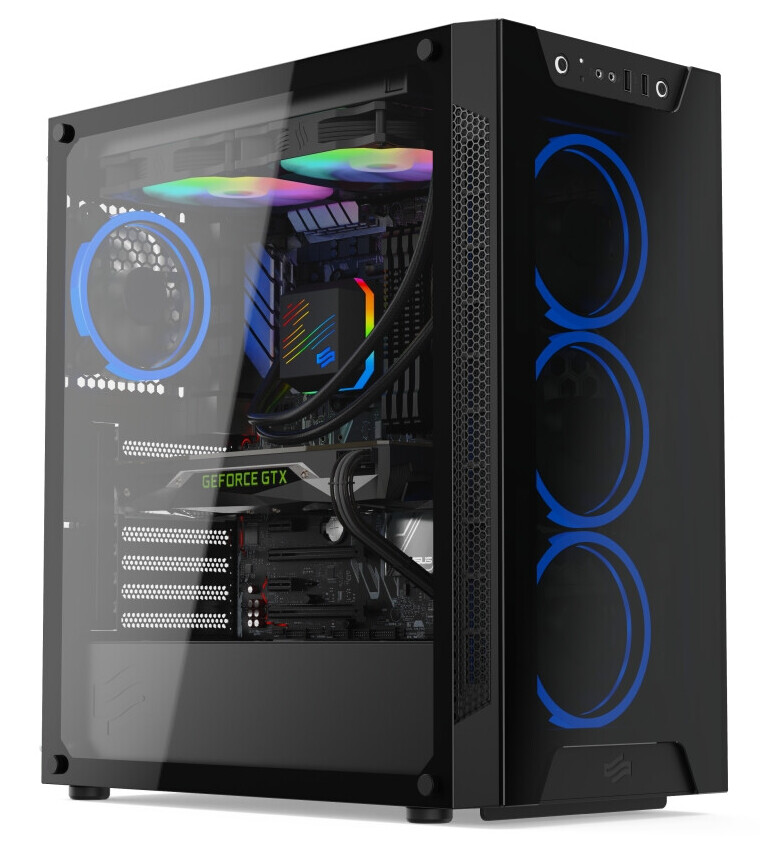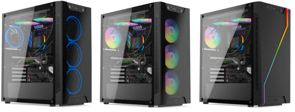Alle drei Modelle werden mit einem Hartglass-Seitenfenster ausgeliefert und heben so die verbauten Komponenten hervor. Das I/O Panel befindet sich im oberen Bereich der Front. Neben dem Power- und den Reset-Knopf, ist dieses mit zwei USB 3.2 Gen 1 Ports und jeweils einer 3,5mm-Buchse für Mikrofon und Kopfhörer ausgestattet.