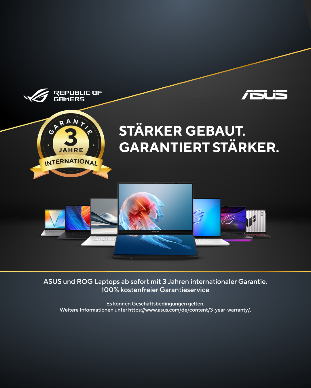 ASUS erhöht die Herstellergarantie für sämtliche Consumer- und Gaming-Notebooks auf drei Jahre. Diese Entscheidung unterstreicht das Vertrauen des Unternehmens in die Langlebigkeit und Zuverlässigkeit seiner Produkte und trägt zur Steigerung der Kundenzufriedenheit bei.