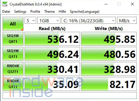 Der Hersteller unserer verbauten Kingston A400 240 GB M.2-SSD gibt eine Lesegeschwindigkeit mit bis zu 500 MB/s an. Diese Geschwindigkeit erreicht die SSD auch in unserem Test. Die Schreibrate wird mit 300 MB/s angegeben, wir erreichen hier einen Wert von knapp 500 MB/s, gehen hier aber von einem Auslesefehler aus. Im Lastzustand wurde eine Temperatur von maximal 42 °C gemessen um Idle waren es knapp 28 °C.