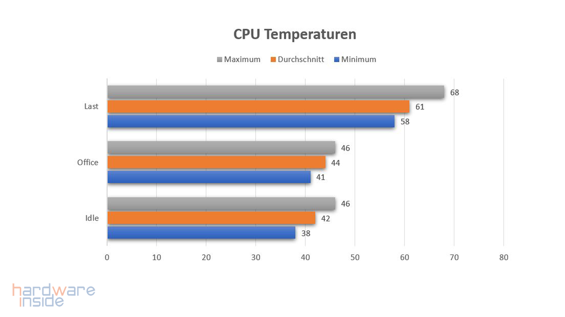 Die Kühleinheit hinterließ ebenfalls einen guten Eindruck. Der Core i3 12100 erreicht in unseren Tests bis zu 68 °C unter Last. Im 2D Betrieb sind es nur 38 °C. Die integrierte Grafikeinheit lag im 2D Betrieb bei 29 °C und unter Last im 3D-Betrieb bei 68 °C. Somit können wir sagen, dass die entstandene Abwärme durch die zahlreichen Aluminiumfinnen gut abgeführt wird.