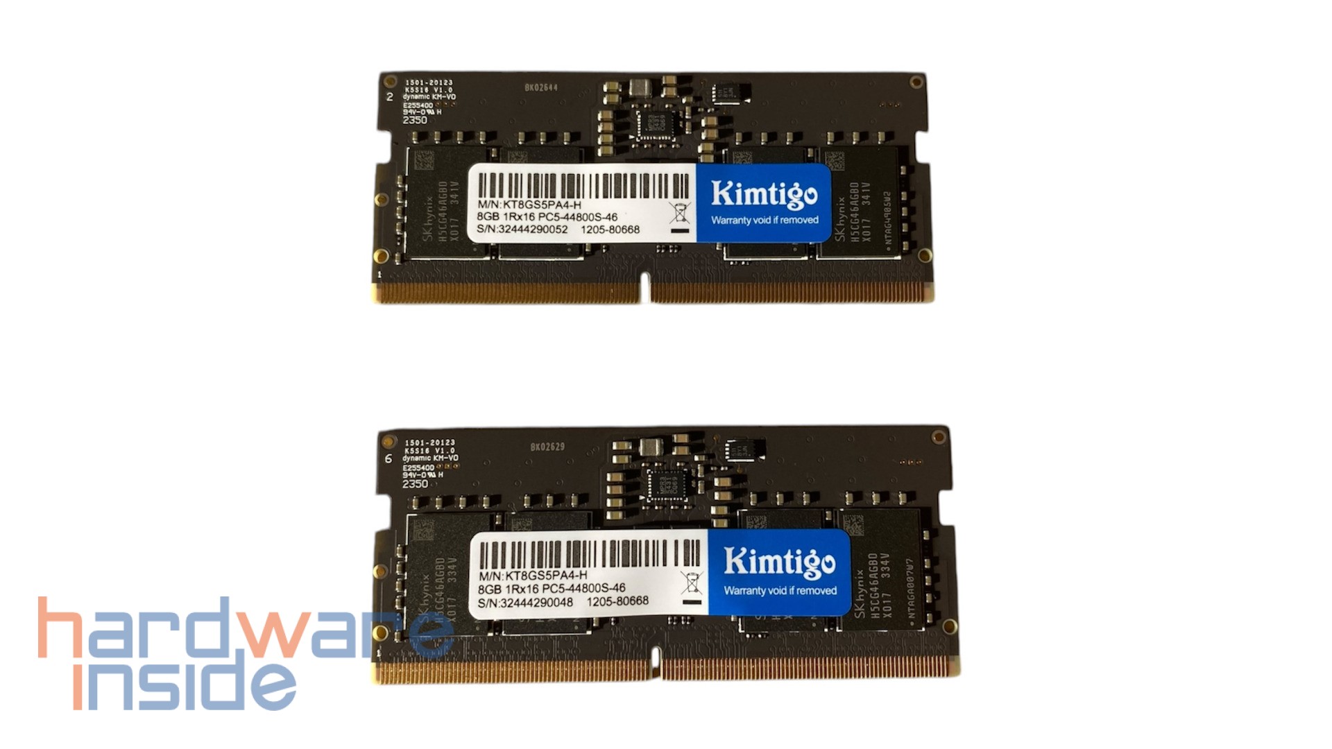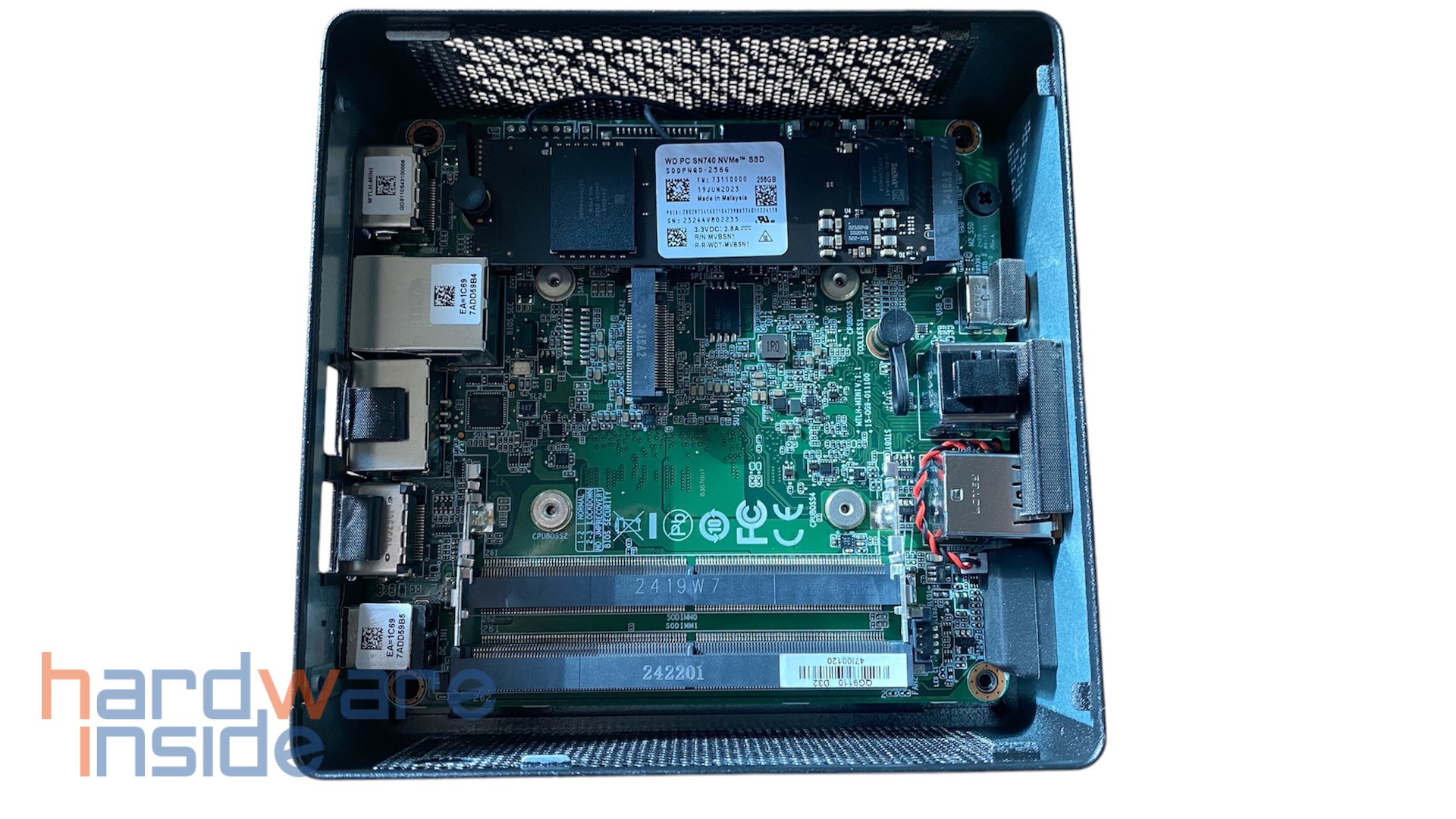 Bevor wir uns weiter der im Inneren verbauten Hardware widmen, lösen wir die Kabel der Rückwand vom Motherboard und entfernen die Rückwand. Als Nächstes bauen wir die RAM-Module aus, um zu prüfen, was ECS hier verbaut hat. Bei den Modulen handelt es sich um zwei Kimtigo 8 GB PC5-44800S-46 (DDR5 5600 MT) Laptop SO-DIMM Speichermodule. Die verbaute WD PC SN740 NVMe M.2 SSD hat eine Kapazität von 256 GB und ist über PCIe x4 angebunden. Auf dem PCB ist gut zu erkennen, dass die Technik und der Speicher von SanDisk produziert wurde.