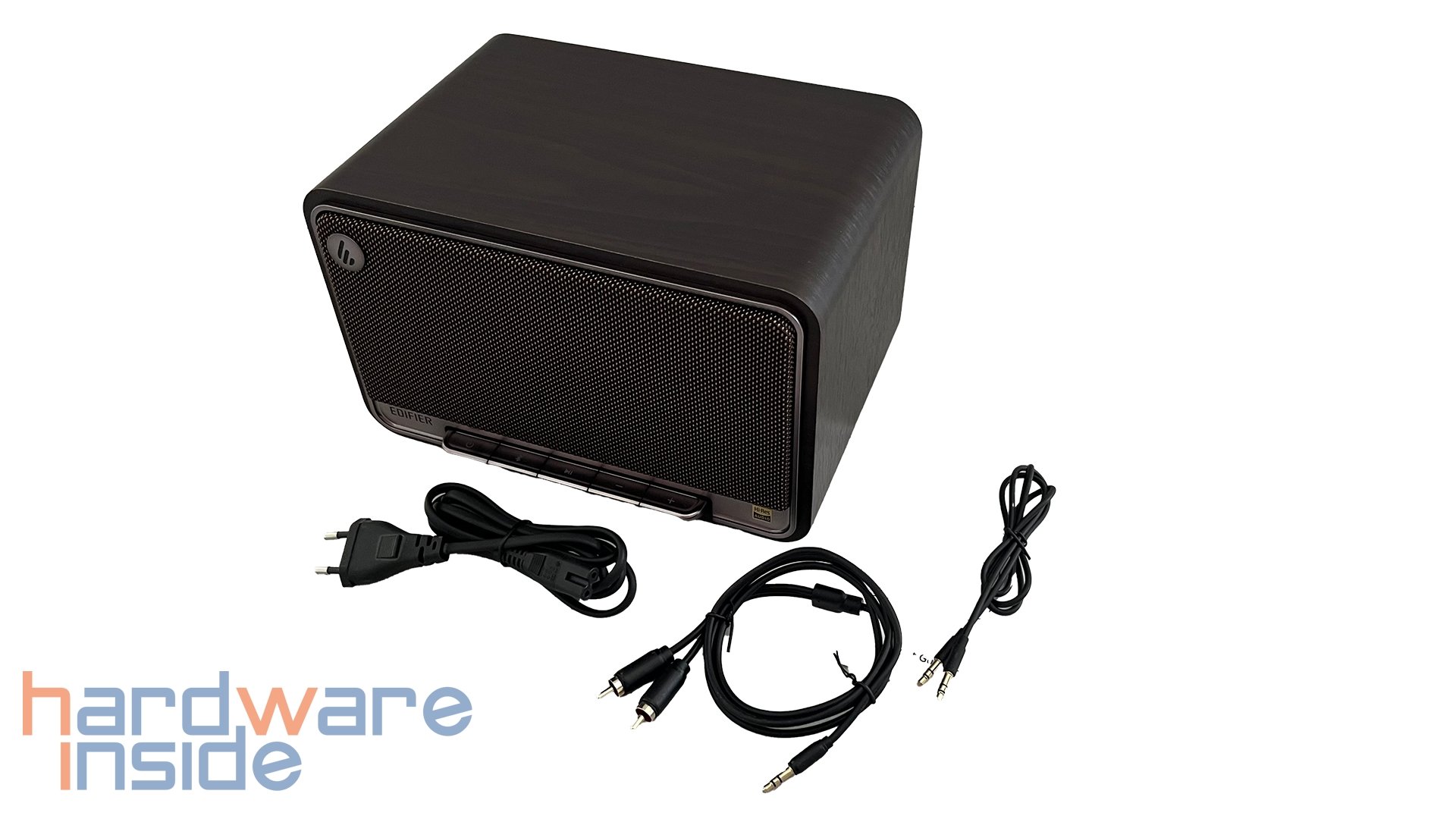 Der Edifier D32 zeigt sich in einer Farbkombination aus dunklem Wallnussholz und messingfarbenen Akzenten. Dies wird von dem schwarz-kupfernen Gewebe der Mantelfläche betont, aber auch durch die filigrane Holzoptik der beiden Flächen oben und unten. Abgerundet wird die quadratische Form, im wahrsten Sinne des Wortes, durch die gebogenen Kanten, die keine Unterbrechung der Holzmaserung vorsehen. Das verleiht dem D32 einen höherwertigen Eindruck.