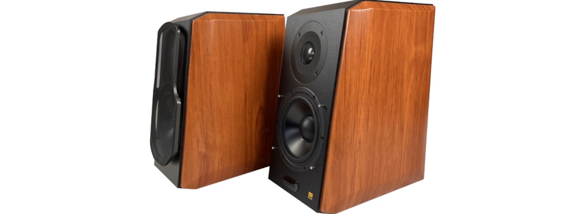Der Korpus der Lautsprecher ist in unserem Fall in der Farbe Wallnuss foliert. Die Kontrastfarbe ist schwarz mit einer leichten Lederoptik. Der Korpus der Lautsprecher besteht aus Holz, während die Standfüße aus Gummi gefertigt wurden. Die Lautsprecher sind, wie man auf dem Bild oben erkennen kann, leicht geneigt und sind somit, für den optimalen Hörgenuss, auf die Ohrhöhe angehoben. Aufmerksame Hörer erkennen sofort den Unterschied, wenn die klangliche Ausrichtung nicht unmittelbar auf die Ohren stößt – es hört sich dumpfer an.![]()