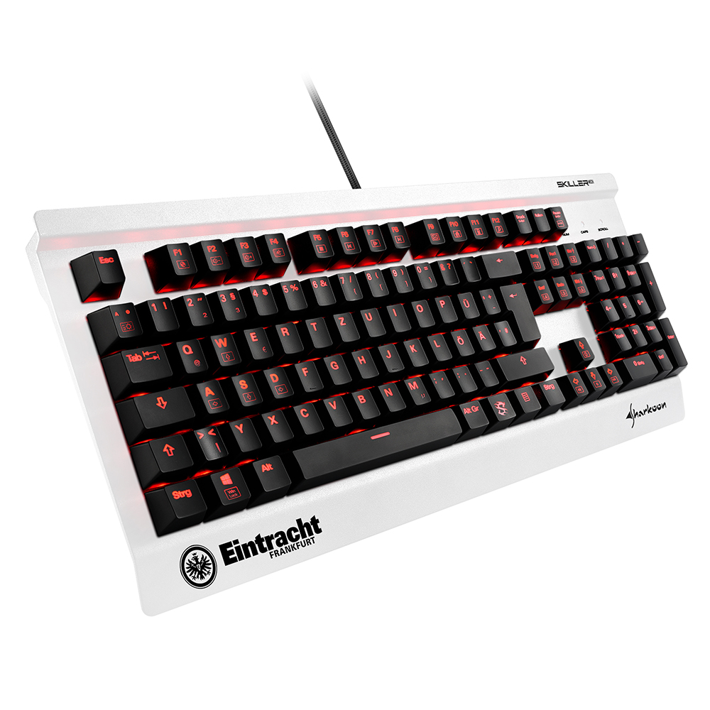 Auch die mechanische Gaming-Tastatur SKILLER MECH SGK3 hat passend zur Drakonia II Eintracht Frankfurt Sonderedition einen neuen Anstrich erhalten: Die Oberfläche aus verstärktem Metall ist weiß lackiert, während die schwarzen, freistehenden Tasten die rote Hintergrundbeleuchtung kontrastieren. Das Adler-Logo sowie der Eintracht-Frankfurt-Schriftzug unterhalb der Tasten runden die SKILLER MECH SGK3 Eintracht Frankfurt Sonderedition optisch ab. Für die Tastatur steht ebenfalls eine Software auf der Herstellerseite als Download bereit. In dieser kann neben der Beleuchtungsfarbe auch die Tastenbelegung und die Empfindlichkeit geändert sowie Makros erstellt werden. Als Schalter wurden die bei Gamern beliebten, linearen Kailh Red des chinesischen Schalterspezialisten Kaihua verbaut.