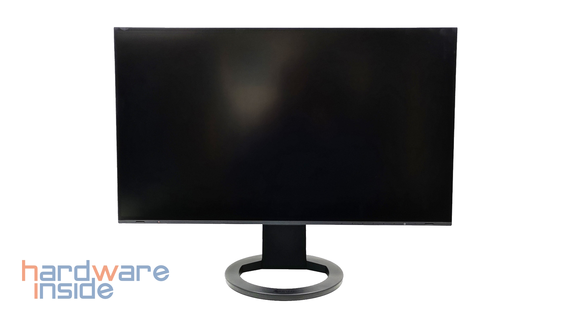 Im ausgeschalteten Zustand wirkt das Display des EIZO FlexScan EV2781 zu den Seitenrandlos. Lediglich der untere Rand ist etwa 15 mm breit, er beherbergt die Steuerelemente, welche von vorne zu bedienen sind. EIZO setzt auf berührungsempfindliche Flächen, die zügig reagieren. Das Display ist matt, so dass es bei bestimmten Lichtverhältnissen zu keinen Spiegelungen kommen kann.