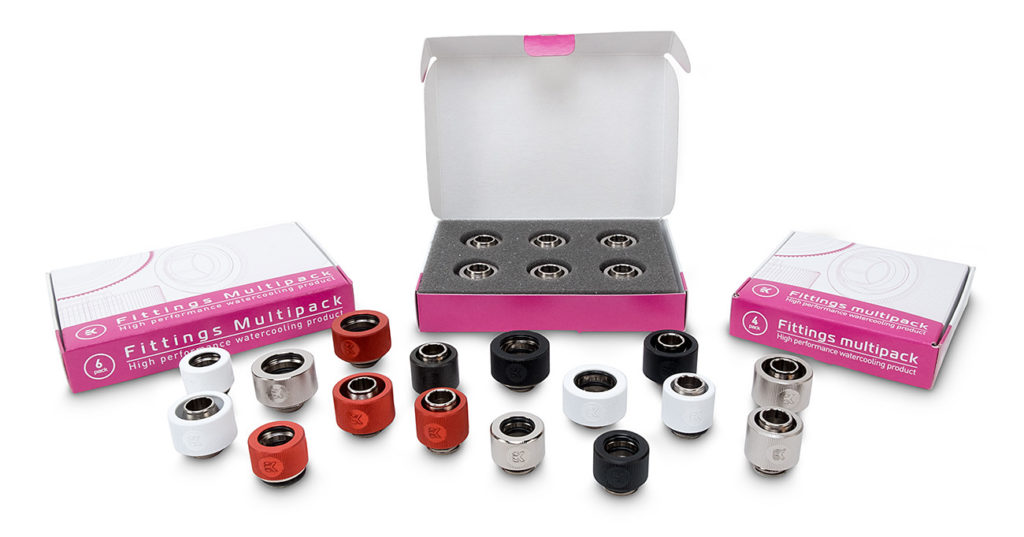 Water Blocks, der slowenische Hersteller von Flüssigkeitskühlkomponenten für Computer, führt vier- und sechsteilige Multipack-Optionen der gängigsten Fittings und -Farben ein. Diese Multipack-Optionen vereinfachen die Auswahl der Anzahl die für einen Flüssigkeitskühlkreislauf erforderlichen Fittings. Der Anwender kann vier- und sechsteilige Packungen miteinander kombinieren, um die gewünschte Anzahl der benötigten Anschlüsse zu erhalten. Die verpackten 1/4″ Anschlüsse bringen auch zusätzliche Sicherheit während des Transports und die Benutzer haben eine schöne Box, in der sie ihre Fittings verstauen können.