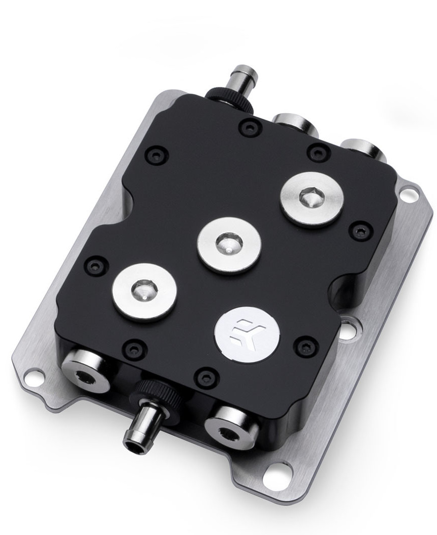 Der Wasserblock EK-Annihilator PRO verfügt über insgesamt 9 Anschlüsse, die vielfältige Anschlussmöglichkeiten bieten. Drei Anschlüsse an der Oberseite haben ein Standard G1/4-Zoll-Gewinde und sind für Workstations und größere Server-Racks gedacht. Die 6 seitlichen Anschlüsse sind für die Verwendung mit niedrigem Profil gedacht und haben ein G1/8-Zoll-Gewinde.