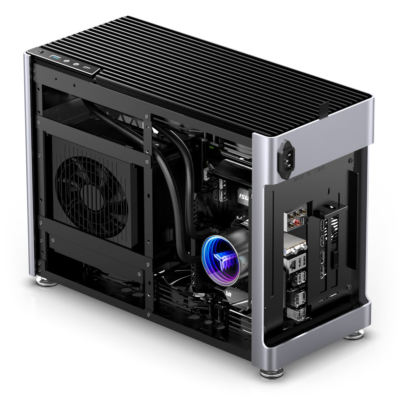 Der Single-Chamber-Aufbau mit horizontaler GPU und AIO-Kühler ermöglicht den Einsatz eines bis zu 360 mm großen Radiators. Weiterhin ist für lange High-End-Grafikkarten genug Platz. Durch die Größe des Radiators wird die Wahl auf ein SFX-Netzteil mit max. 115 mm Länge beschränkt.