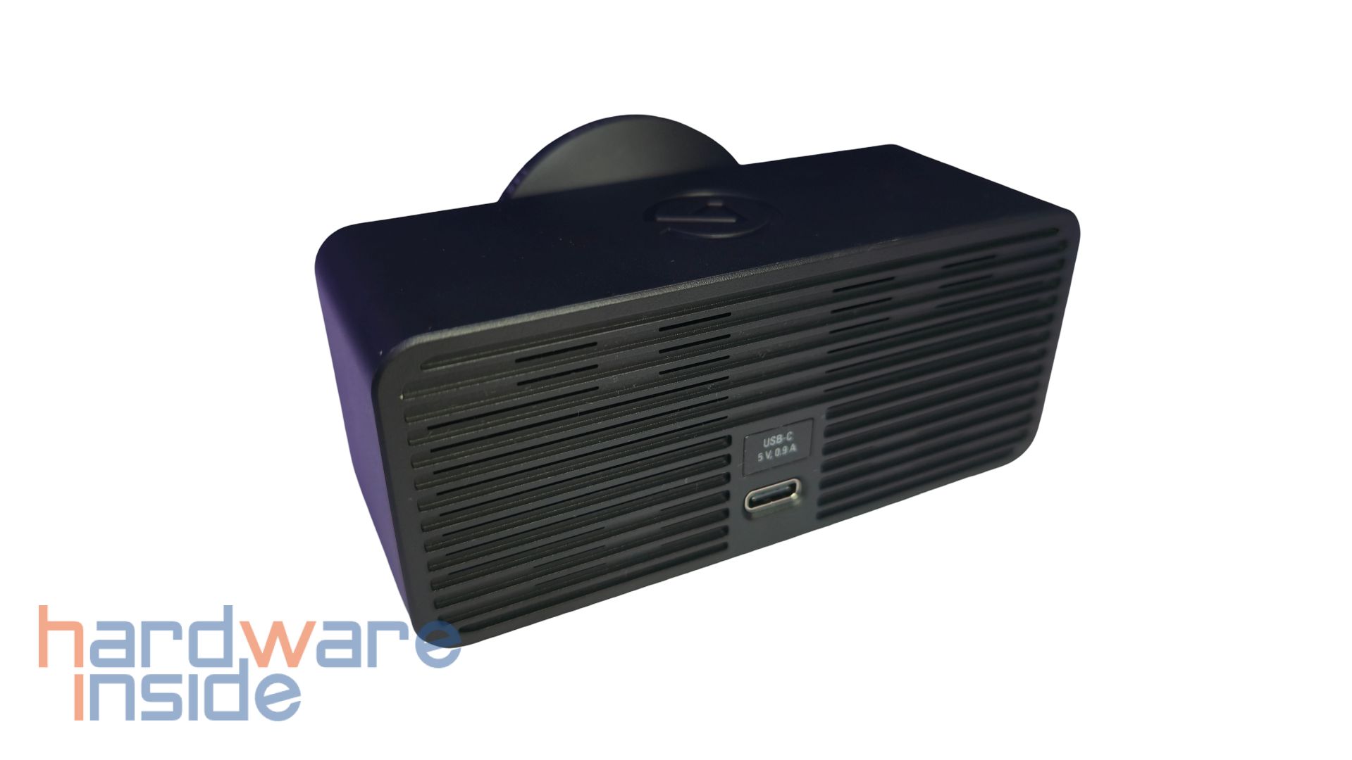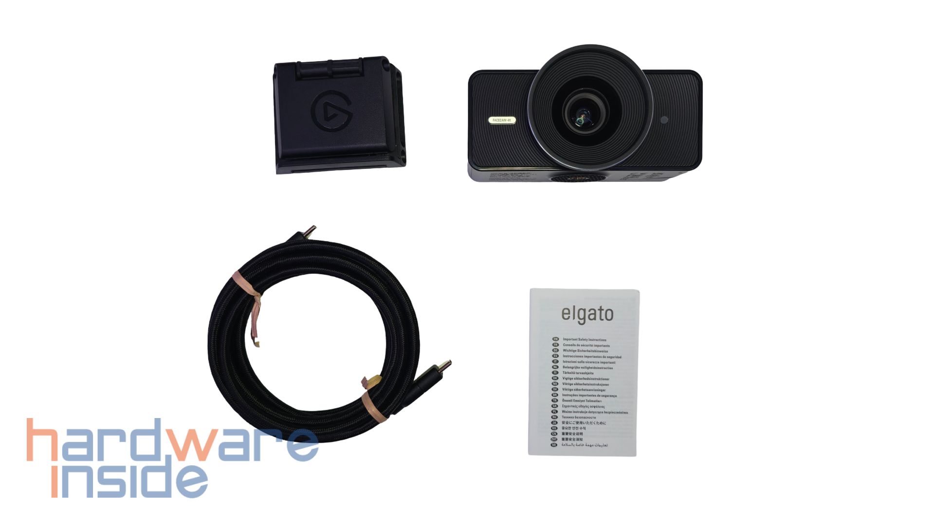 Auf der oberen Seite ist mittig das Elgato-Logo eingearbeitet. Hier ist die matte Oberfläche im Vergleich zu den glänzenden Akzenten erkennbar. Die Rückseite des Kamerakörpers ist mit Lüftungsschlitzen versehen, wodurch bei genauem Hinschauen die Platine der Kamera durchscheint. Mittig auf der Rückseite ist ein USB-C-Anschluss, ebenfalls mit silbernem Rand zu finden. Über diesem Anschluss befindet sich außerdem ein Hinweis zur Spannung i.H.v. fünf Volt bei einer Stromstärke von 0,9 Ampere.