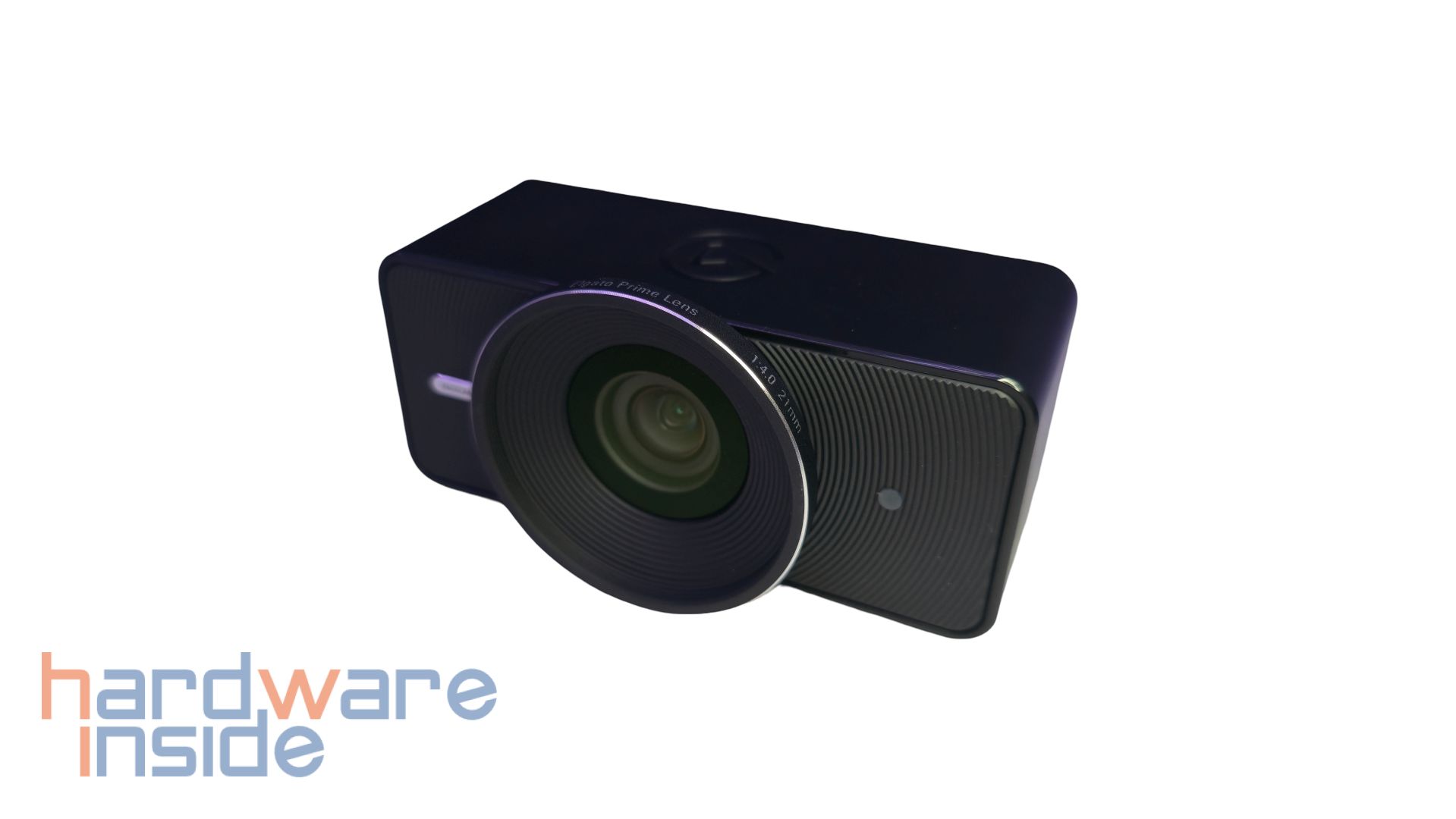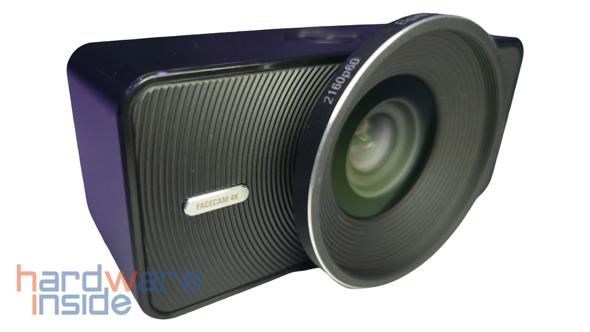 Die Kamera hat einen rechteckigen Körper, wobei die Linse rund absteht. Frontal ist eine geriffelte Oberfläche zu sehen, die konzentrisch verläuft, sodass das Design der Linse mit dem Körper verschmilzt. Auf der konzentrisch geriffelten Oberfläche ist ein fein verarbeitetes, silbernes Etikett mit einer gelaserten Aufschrift der Produktbezeichnung „FACECAM 4K“ zu finden. Die Linse ragt deutlich über den Körper hinaus und ist durch den größeren Linsenkorpus geschützt. Eine Schutzkappe gegen Kratzer und Privatschutz ist gesondert erhältlich, was wir jedoch schade finden. Mit einem 3D-Drucker kann man sich hierbei schnell behelfen. Rund um die Linse herum ist ein feiner silberner Rand zu sehen. An diesem Rand entlang sind weitere Aufschriften in Silber mit technischen Details zur Linse eingraviert.