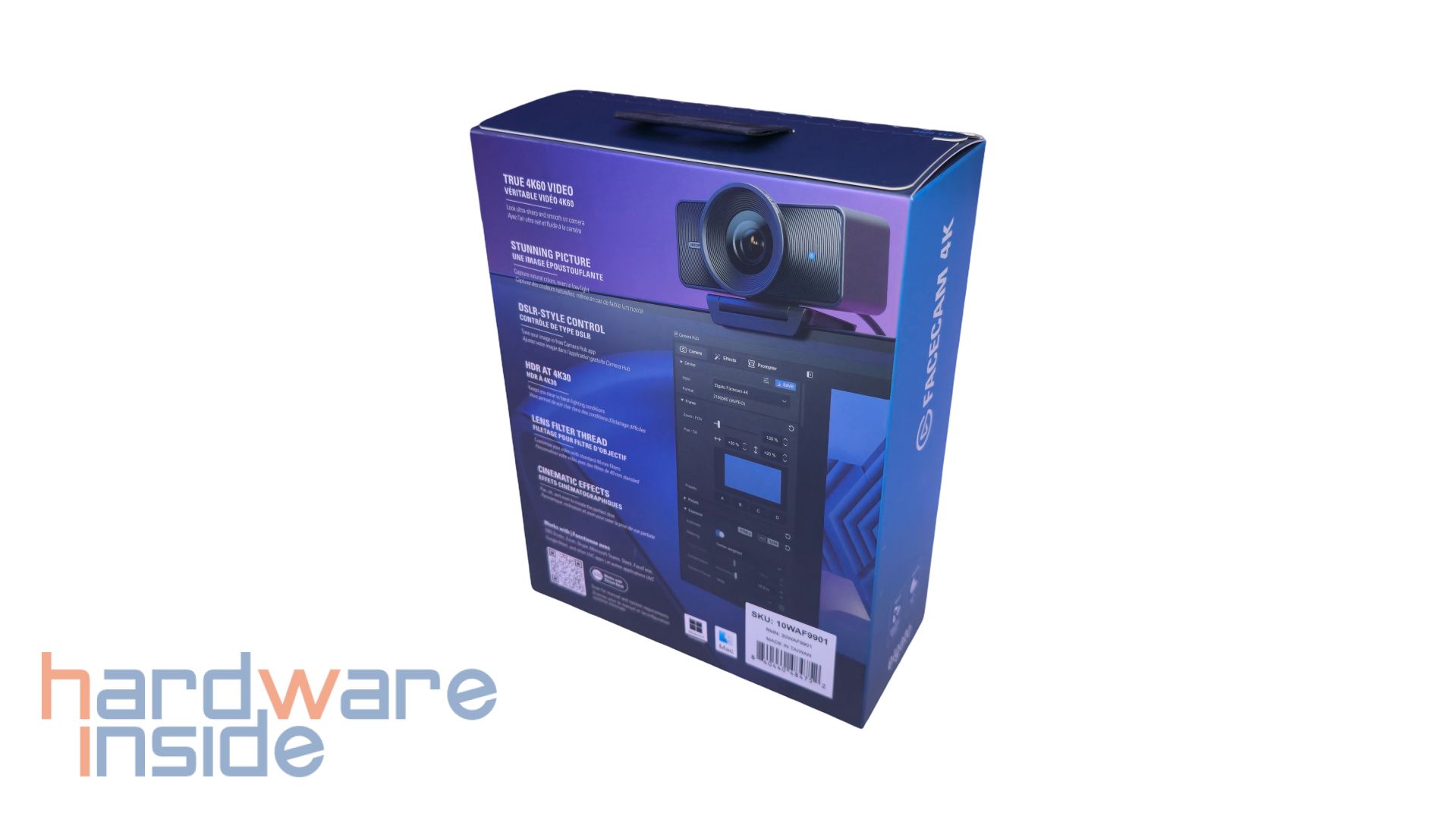 Der Karton ist in einigen blauen Akzenten gehüllt und besitzt weiße Aufschriften. Frontal ist die Kamera mit ihrer großen Linse zu sehen, die auf einem blauen bis türkisen Displayrahmen platziert ist. Auf der Vorderseite sind der Modellname, Hersteller und ein paar Features zu sehen. Die linke Seite der Verpackung zeigt ebenfalls den Modellnamen, den Hersteller und verweist zusätzlich auf die nachhaltige Verpackung. Auf der rechten Seite der Verpackung sind weitere Features mit kleinen Motiven aufgedruckt und darunter der Verpackungsinhalt visualisiert. Die Rückseite des Kartons zeigt neben den blauen Akzenten auch einen violetten Hintergrund, was an die typischen Streamer-Farben erinnert. Hier sind weiterhin Features aufgezählt und kurz erläutert, wobei auch ein Blick auf die Camera Hub Software riskiert wird.