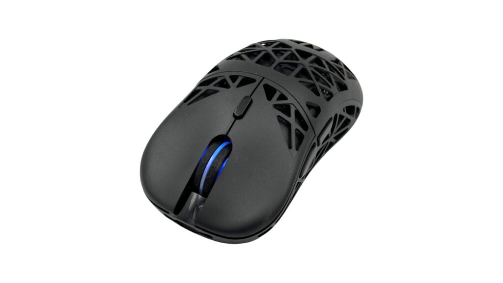 Die ENDORFY LIV Plus Wireless Gaming Maus verfügt über ein sehr aufwendiges Design mit mehreren futuristisch anmutenden Öffnungen im größten Teil des Gehäuses. Beim Material kommt schwarzer matter ABS-Kunststoff zum Einsatz. Im hinteren Bereich finden wir das Logo des Herstellers, eingestanzt im Gehäuse. Dahinter verbirgt sich eine milchige weiße Fläche, welche später vermutlich ausgeleuchtet wird. Im vorderen Bereich verfügt die Maus über ihre beiden Haupttasten, unter denen sich Schalter von Kailh befinden. Zwischen den Tasten liegt das Mausrad, welches im Betrieb die gewählte Auflösungsstufe in verschiedenen Farben anzeigen kann. Es ist gummiert und verfügt über eine angenehme Rasterung. Außerdem lässt das Mausrad sich drücken, wodurch es zu einer weiteren Taste wird. Hinter dem Mausrad liegt eine weitere Taste, welche im Auslieferungszustand dem Durchschalten der Auflösungsstufen dient.