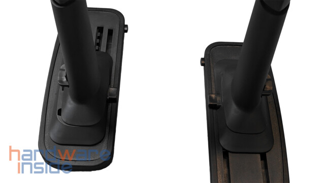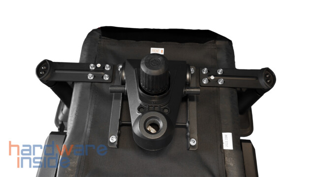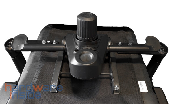 Die Sitzfläche folgt dem gleichen Muster wie die Rückenlehne – der größte Teil, mit dem wir in Berührung kommen, ist mit Stoff bezogen, während außen Kunstleder zum Einsatz kommt. Der rote Kontrast setzt sich auch hier fort und ziert den gesamten Stuhl an den jeweiligen Enden. Die Unterseite der Sitzfläche ist das Herzstück für unsere ergonomischen Tests. Das Bild zeigt bereits den zusammengebauten Zustand – hier muss also viel geschraubt werden. Die Steuerung umfasst die Kippfunktion, deren Stärke mit einem Drehknopf verändert werden kann, und die Höhenverstellung, mit der die Sitzhöhe von 45 bis 50 cm eingestellt werden kann. Auf der rechten Seite des Sitzes befindet sich ein Hebel zum Verstellen der Rückenlehne, der durch vertikales Ziehen die Klemme löst, die die Rückenlehne fixiert. Beim Ziehen ist jedoch Vorsicht geboten, da die Rückenlehne ohne Gegengewicht sehr schnell zurückfedert.
