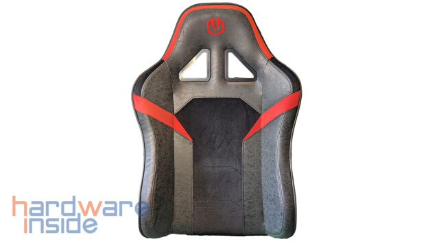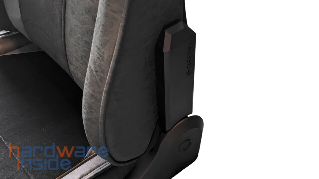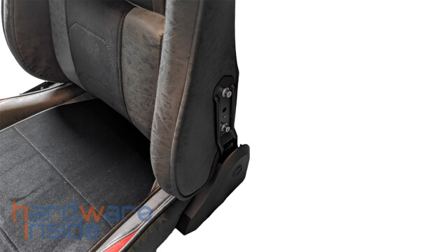 Wie bereits erwähnt, ist die Rückenlehne an den Schalensitz aus dem Motorsport angelehnt. Im Gegensatz dazu ist unsere Rückenlehne jedoch sehr bequem und mit einer Mischung aus Stoff und Leder bezogen. Der Stoff beschränkt sich auf die Stellen, an denen unser Rücken und unsere Hände am meisten Kontakt haben, also in der Mitte der Innenseite und am oberen Ende der Rückenlehne. Vor allem der Stoff fühlt sich sehr angenehm an und gibt dem ganzen Stuhl das gewisse Etwas. Das Kunstleder wirkt besonders schön, wenn Licht darauf fällt. Ein weiterer Pluspunkt ist die Polsterung der Rückenlehne selbst, denn durch die Verwendung von dickem Schaumstoff liegt der Rücken angenehm an und drückt nicht gegen einen spürbaren Widerstand.
