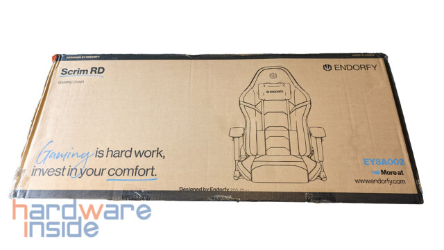Der Stuhl wird in einem typischen Pappkarton geliefert. Der Karton ist nicht unbedingt aufwendig gestaltet, was aber nicht weiter tragisch ist. An den Längsseiten befinden sich eine Abbildung des Stuhls, ein Firmenlogo, die Produktbezeichnung und der Schriftzug „Gaming is hard work, invest in your comfort“, auf den wir später noch eingehen werden. Denn zunächst muss das schwere Paket an seinen Montageplatz gebracht werden.