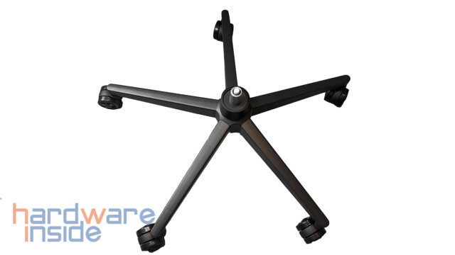 Die gesamte Konstruktion wird von einer Gasdruckfeder der Klasse 4 gehalten. Diese kann bis zu 150 kg tragen – der ENDORFY Scrim RD ist laut Hersteller jedoch für 120 kg ausgelegt. Die Feder wiederum sitzt in einem Metallgestell und verteilt das Gewicht auf fünf Nylonrollen, die den gesamten Stuhl geschmeidig über Laminat, Fliesen oder Teppich rollen lassen.