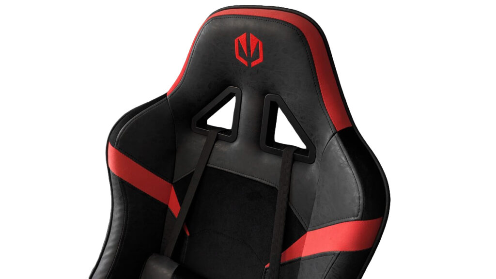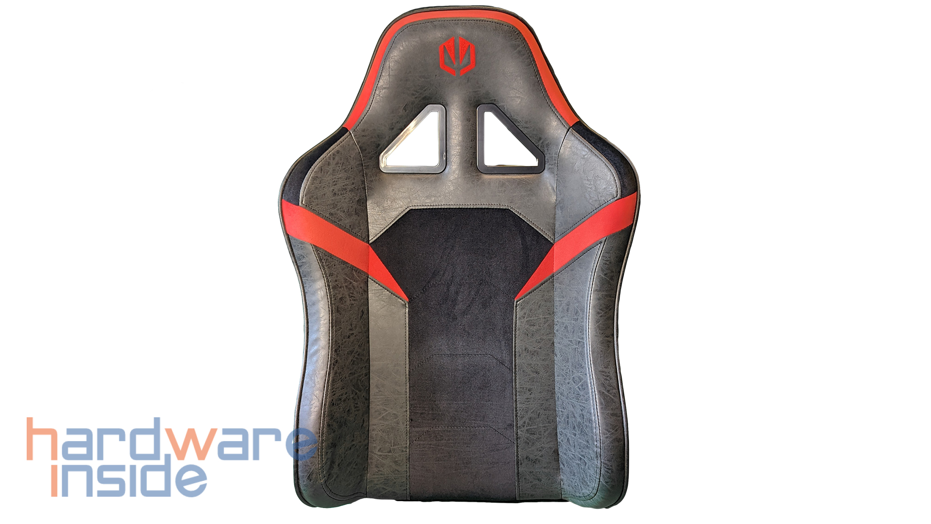 Wie bereits erwähnt, ist die Rückenlehne an den Schalensitz aus dem Motorsport angelehnt. Im Gegensatz dazu ist unsere Rückenlehne jedoch sehr bequem und mit einer Mischung aus Stoff und Leder bezogen. Der Stoff beschränkt sich auf die Stellen, an denen unser Rücken und unsere Hände am meisten Kontakt haben, also in der Mitte der Innenseite und am oberen Ende der Rückenlehne. Vor allem der Stoff fühlt sich sehr angenehm an und gibt dem ganzen Stuhl das gewisse Etwas. Das Kunstleder wirkt besonders schön, wenn Licht darauf fällt. Ein weiterer Pluspunkt ist die Polsterung der Rückenlehne selbst, denn durch die Verwendung von dickem Schaumstoff liegt der Rücken angenehm an und drückt nicht gegen einen spürbaren Widerstand.
