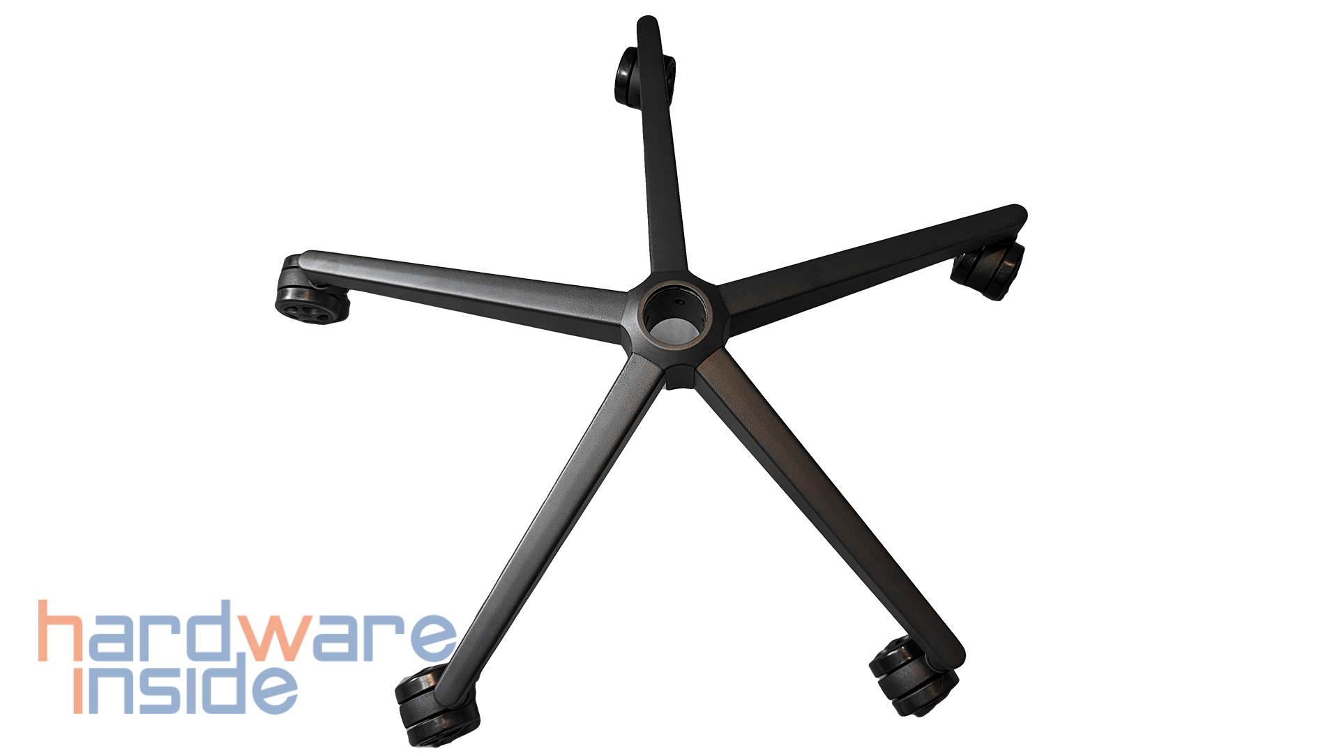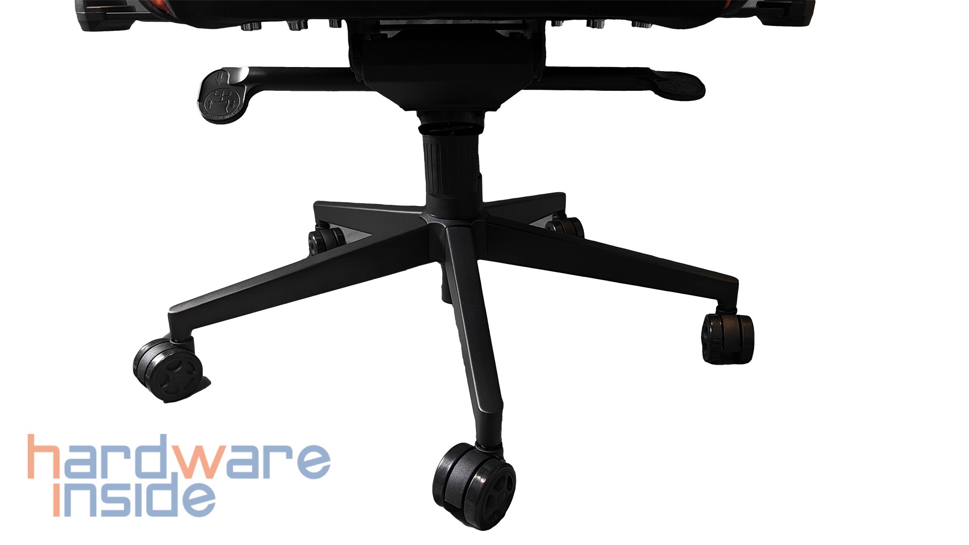 Die gesamte Konstruktion wird von einer Gasdruckfeder der Klasse 4 gehalten. Diese kann bis zu 150 kg tragen – der ENDORFY Scrim RD ist laut Hersteller jedoch für 120 kg ausgelegt. Die Feder wiederum sitzt in einem Metallgestell und verteilt das Gewicht auf fünf Nylonrollen, die den gesamten Stuhl geschmeidig über Laminat, Fliesen oder Teppich rollen lassen.