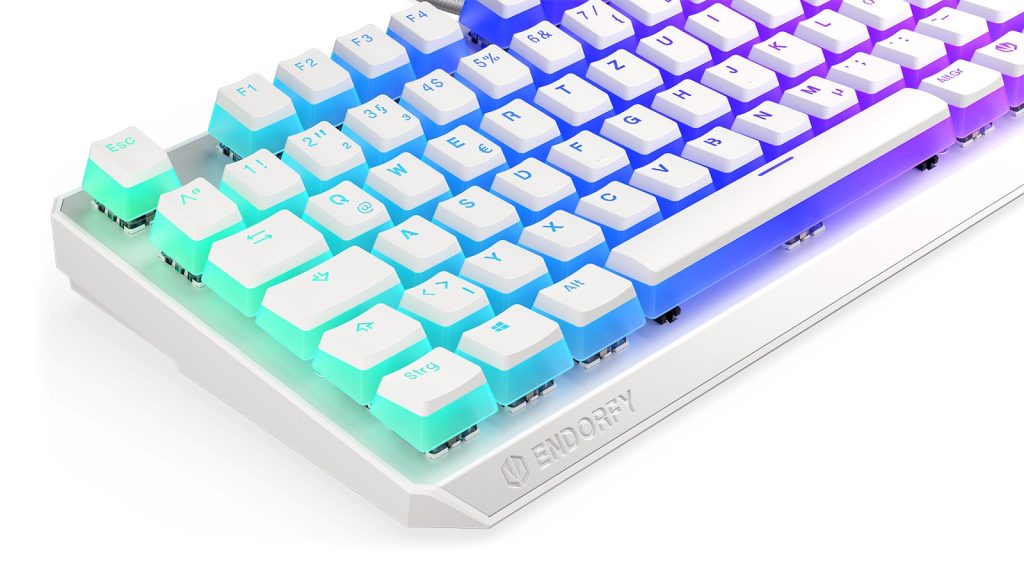 Die Tastenkappen verwenden die unikale ENDORFY-Schriftart und werden auf mechanischen Switches von Kailh befestigt. Diese langlebigen Bösewichte mit extra verstärkter Schaftstruktur haben eine geschätzte Lebensdauer von 50 Millionen Klicks und halten damit viel aus.
