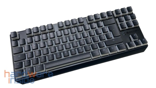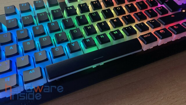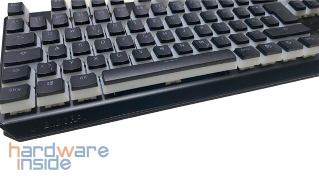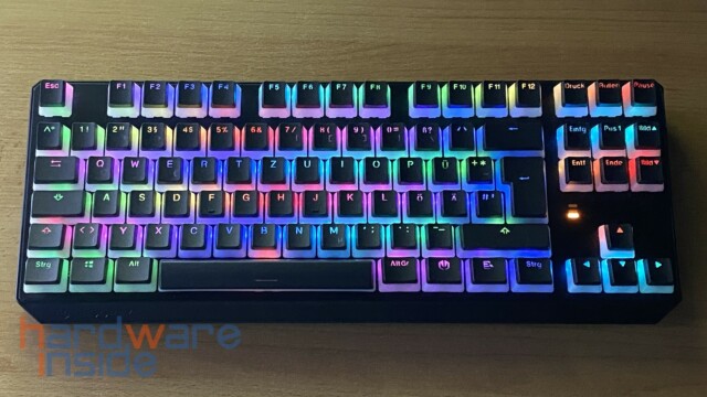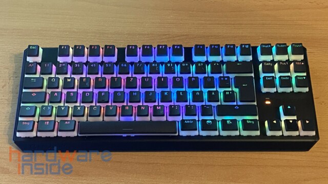 Wie bereits oben erwähnt, sind die 87 Tastenkappen in Pudding-Optik gefertigt. Das heißt, der untere Teil der Kappen ist in einem durchscheinenden milchigen Weiß gehalten, wobei die Oberseite bis auf die Beschriftung in schwarz gestaltet ist. Im Betrieb werden sie von darunter liegenden ARGB-LEDs beleuchtet. Die Kappen bestehen aus PBT und sind Double Shot gefertigt. Diese sind dadurch deutlich haltbarer und bieten ein angenehmeres Tippgefühl, trotz eines insgesamt höheren Tastenfelds. Etwas schade finden wir, dass keine Sonderfunktionen auf den Tasten zu finden sind. So müssen die Funktionen aus dem Kopf ausgeführt werden.