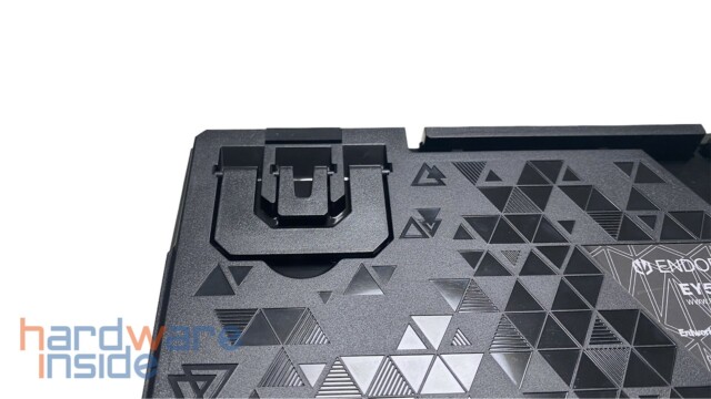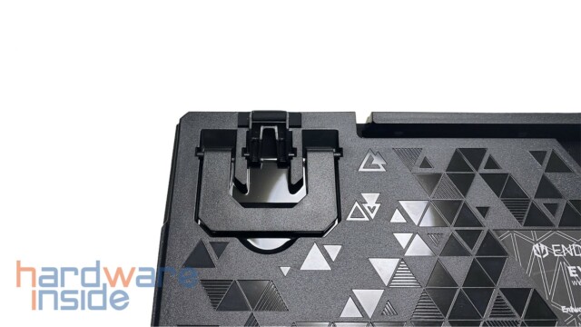 Die obere Abdeckung besteht aus einer mattschwarz lackierten Aluminium-Platte, deren Front nach unten abgeschrägt ist. Die Platte ist in den unteren Gehäuseteil eingelassen und dessen Oberfläche ist dabei leicht angeraut. Auf der linken Seite ist auch ein ENDORFY-Logo samt Schriftzug eingestanzt. Ein weiterer Schriftzug mit dem Logo ist über den Pfeiltasten zu sehen. Daneben befinden sich zwei Status LEDs für die Feststelltaste und als Status-LED für die Akku-Kapazität.