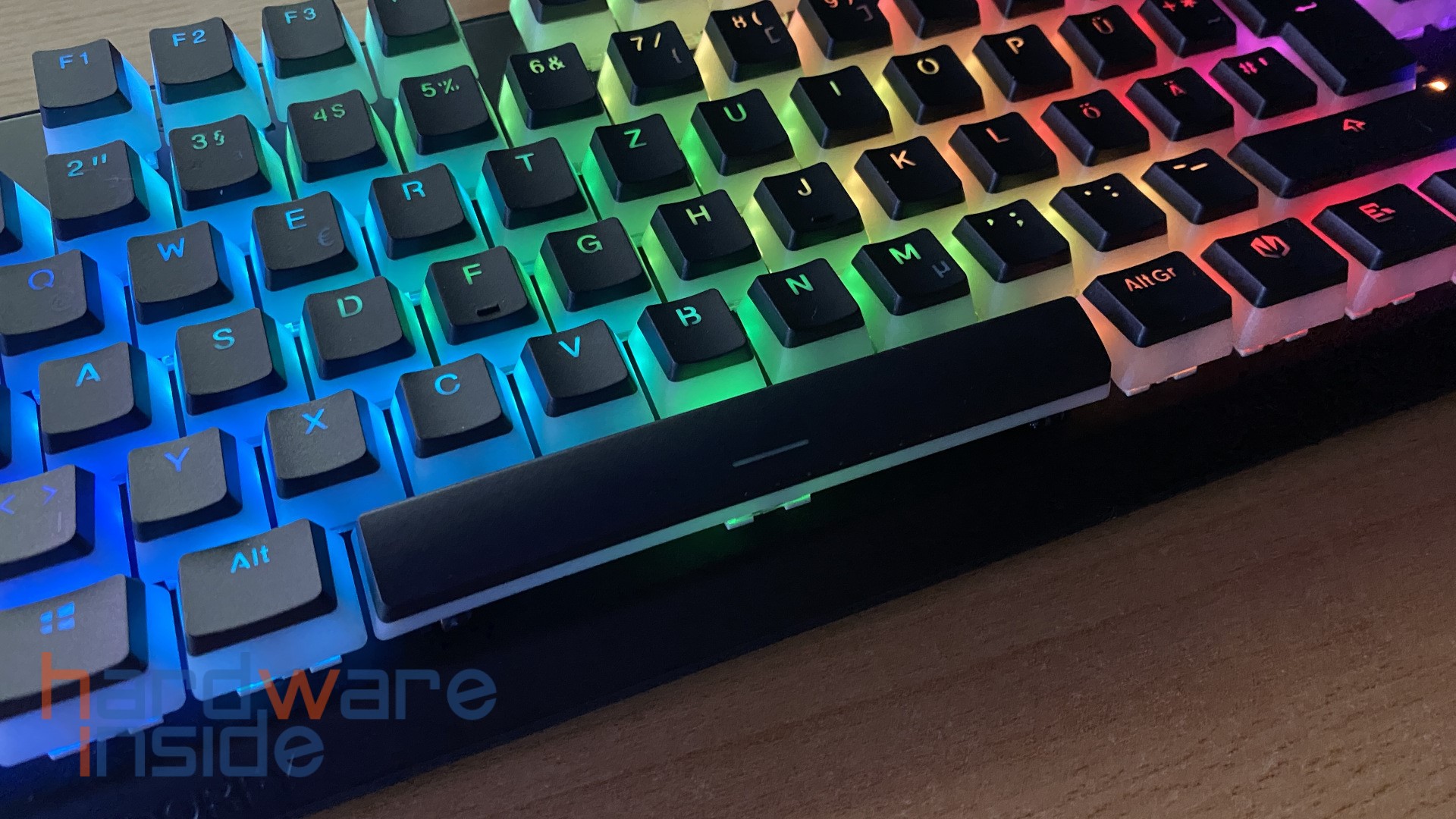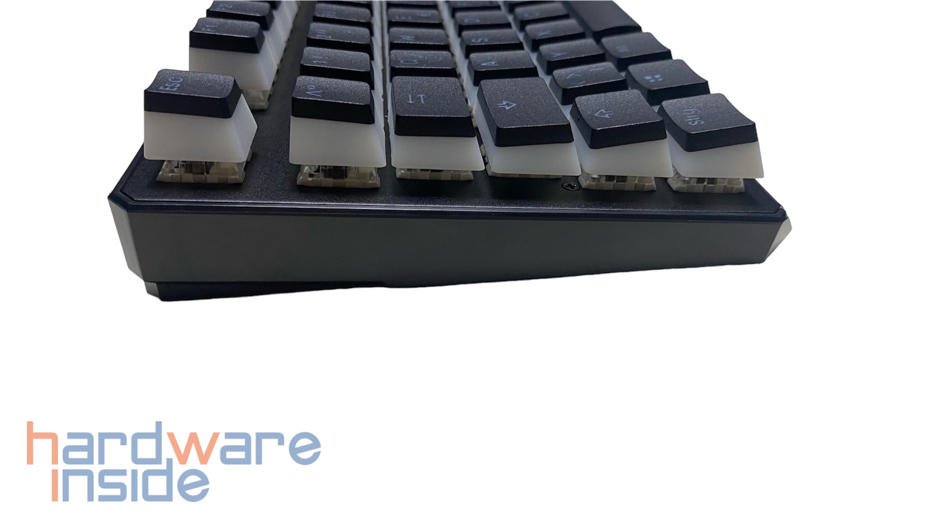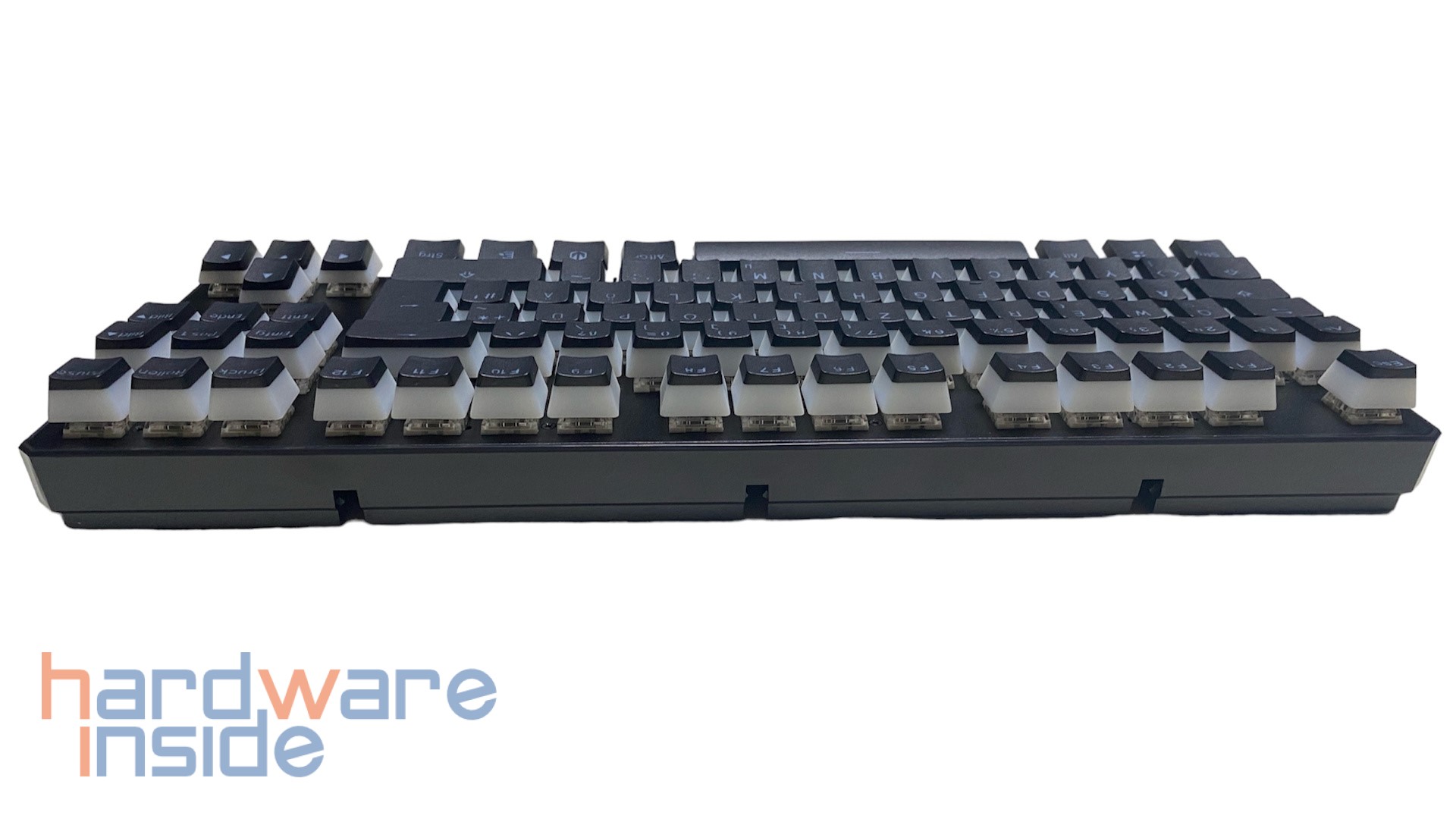 Wie bereits oben erwähnt, sind die 87 Tastenkappen in Pudding-Optik gefertigt. Das heißt, der untere Teil der Kappen ist in einem durchscheinenden milchigen Weiß gehalten, wobei die Oberseite bis auf die Beschriftung in schwarz gestaltet ist. Im Betrieb werden sie von darunter liegenden ARGB-LEDs beleuchtet. Die Kappen bestehen aus PBT und sind Double Shot gefertigt. Diese sind dadurch deutlich haltbarer und bieten ein angenehmeres Tippgefühl, trotz eines insgesamt höheren Tastenfelds. Etwas schade finden wir, dass keine Sonderfunktionen auf den Tasten zu finden sind. So müssen die Funktionen aus dem Kopf ausgeführt werden.