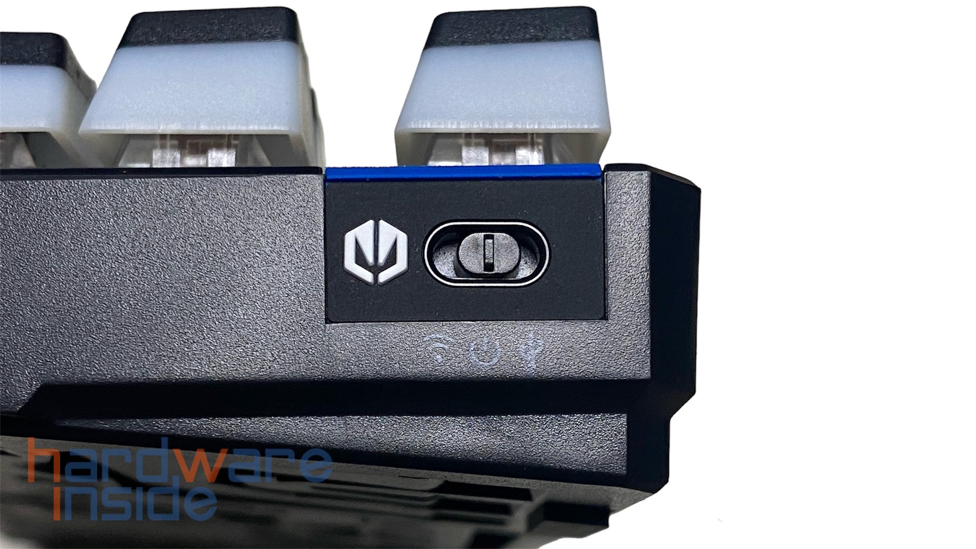 Die obere Abdeckung besteht aus einer mattschwarz lackierten Aluminium-Platte, deren Front nach unten abgeschrägt ist. Die Platte ist in den unteren Gehäuseteil eingelassen und dessen Oberfläche ist dabei leicht angeraut. Auf der linken Seite ist auch ein ENDORFY-Logo samt Schriftzug eingestanzt. Ein weiterer Schriftzug mit dem Logo ist über den Pfeiltasten zu sehen. Daneben befinden sich zwei Status LEDs für die Feststelltaste und als Status-LED für die Akku-Kapazität.
