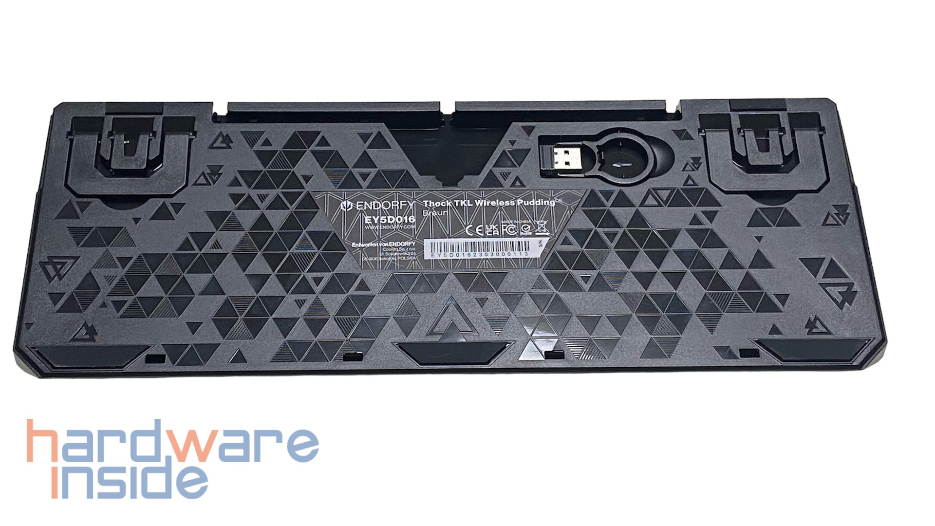 Auch der USB-Funkempfänger und das Tool zum Ziehen der Tastenkappen sind auf der Unterseite in einer Vertiefung untergebracht. So ist beides auch beim Transport immer schnell verstaubar und falls es benötigt wird, ebenfalls schnell greifbar. Das Tool zum Ziehen der Switches liegt separat bei.