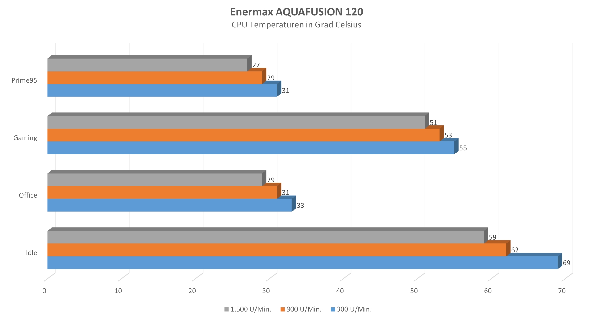 Wir messen die Temperatur anhand der verbauten Sensoren und über ein IR-Thermometer, mit dem wir die Temperatur direkt am Sockel messen. Der Test wird in vier Szenarien mit drei verschiedenen Drehzahlen der Lüfter durchgeführt und die Temperaturen nach jeweils 30 Minuten abgenommen. Die Drehzahl der verbauten Pumpe bleibt auf Maximum, da diese auch bei voller Leistung nicht zu hören ist. Die Tests finden bei einer Raumtemperatur von 22 °C statt. Im Idle kommen so zwischen 27 und 28 °C an unserer CPU zustande. Die höchste Temperatur erreichen wir mit 69 °C im Prime95 Belastungstest – dabei liegt die Drehzahl der Lüfter bei nur 300 U/Min. Die Lüfter erzeugen ab etwa 1.000 U/Min. ein mit 36 dB(A) leicht hörbares Geräusch (gemessen mit TROTEC BS06 Schallpegelmessgerät).