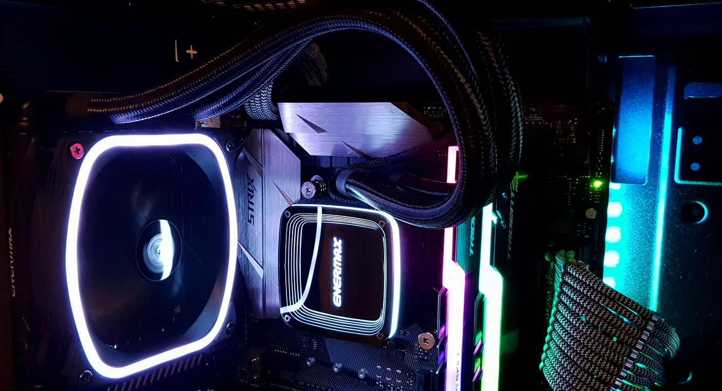 Unser Testsystem verbauen wir im Enermax STARRYFORT SF30 RGB Gaming Tower. Dieser verfügt übrigens auch über die SquA RGB Lüfter. Somit dürfte die AQUAFUSION sich sehr gut in das Gesamtbild einfügen. Beim Mainboard setzen wir auf ein ASUS Z170 Sabertooth mit einem Intel Core i5-6600K. Neben 16 GB G.Skill Trident Z – DDR4 RAM @3.200 MHz verbauen wir auch eine Kingston UV500 SSD mit einer Kapazität von 500 GB. Für die Grafik ist eine EVGA GeForce GTX960 verantwortlich. Die Stromversorgung übernimmt ein EVGA 550 G2 SuperNova Netzteil mit handgefertigten Kabeln von PaYFrog Customs.