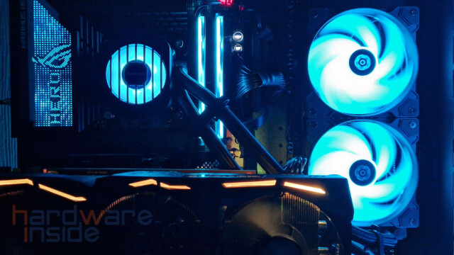 Für unsere Temperaturtests wurden die drei 120 mm Lüfter in der Front konstant auf 35 % gesetzt. Die Temperaturen werden über die Software HardwareInfo ausgelesen. Unsere beiden 120 mm Silent-Flow FDB Lüfter setzten wir via Software auf die minimale, die mittlere und auf die maximale Drehzahl. Dabei untersuchen wir die Temperaturen in drei verschiedenen Szenarien, im Idle, beim Gaming und unter Volllast mit dem Benchmark Cinebench R23 im Loop für jeweils 30 Minuten. Die Pumpe lief während unserer Testphase auf 2700 U/min. Die Lautstärke liegt immer im Auge des Betrachtes und wird von Person zu Person unterschiedlich wahrgenommen. Aus unserer Sicht ist die Lautstärke hier als angenehm leise einzustufen. Selbst unter Volllast konnten wir bei geschlossenem Gehäuse keinen wirklichen Orkan vernehmen. Abgesehen davon sind die erreichten Werte unsererseits Ist-Werte und können natürlich abweichen, je nach verbauter Hardware. Bezüglich der VRMs konnten wir keinen großen Unterschied durch die Regulierung des integrierten 60 mm VRM-RGB-Lüfters während unserer Testphase feststellen. Wir lagen immer im Bereich von 35-51 °C.
