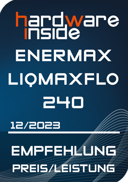 Die ENERMAX LIQMAXFLO 240 mm hat mit ihrer Kühlleistung auch bei geringer Lautstärke unsere Erwartungen übertroffen. Die neue Xtreme-PWM-Pumpe hinterließ dabei ebenfalls einen sehr guten Eindruck. Mit ihren Silent-Flow FDB Lüftern, die über ein prägnantes Kabelanschlusskonzept verfügen und somit spielend leicht zu verbinden sind, wird das Kabelmanagement noch mal deutlich vereinfacht. Durch die brillant mehrfarbigen Lichteffekte sowie die Verarbeitung werden hier definitiv nicht nur RGB-Fans angesprochen. Die ENERMAX LIQMAXFLO 240 mm ist derzeitig im Preisvergleich für unschlagbare 96 € gelistet und aufgrund des gebotene Gesamtpakets sprechen wir hier gerne unsere Empfehlung aus und vergeben unseren Preis-/Leistungs- Award.